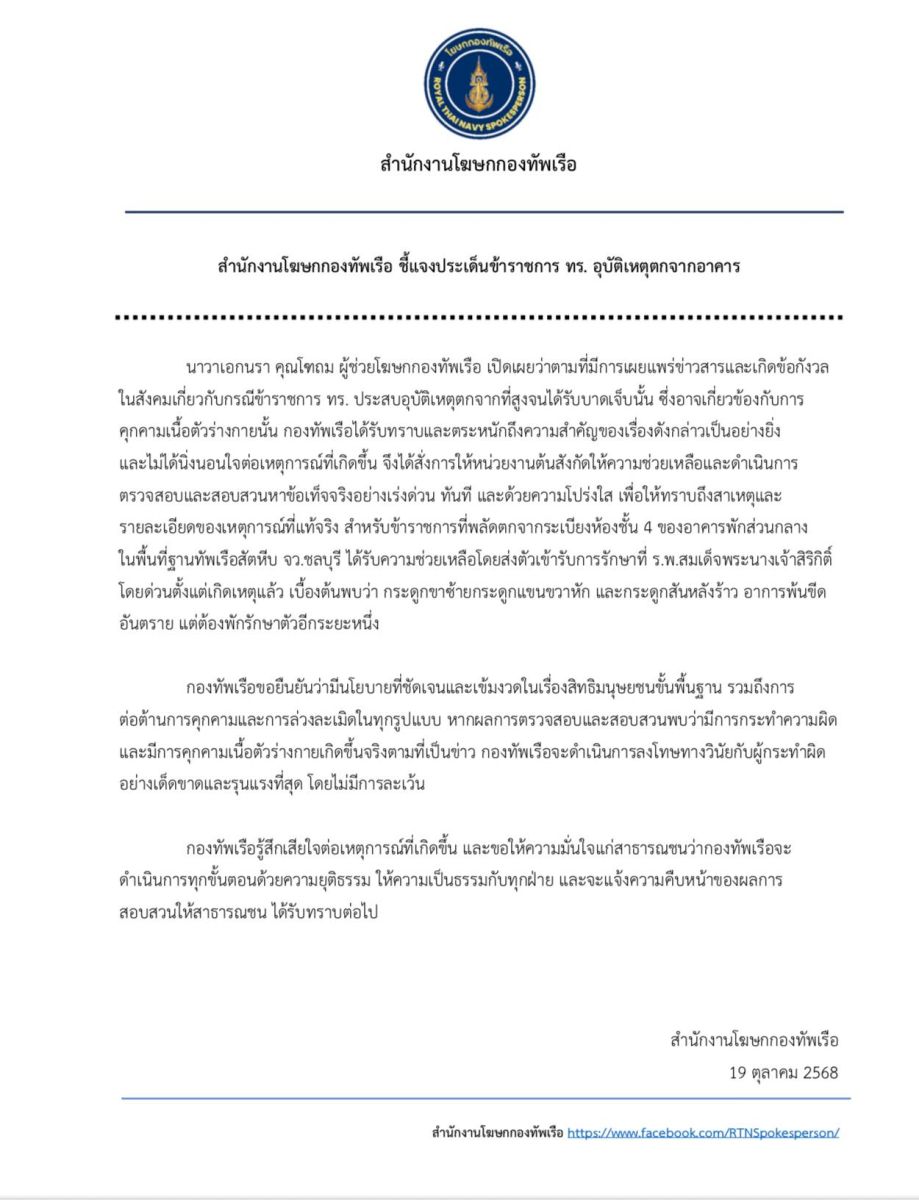 (19 ต.ค.68) นาวาเอกนรา คุณโฑถม ผู้ช่วยโฆษกกองทัพเรือ เปิดเผยว่าตามที่มีการเผยแพร่ข่าวสารและเกิดข้อกังวลในสังคมเกี่ยวกับกรณีข้าราชการ ทร. ประสบอุบัติเหตุตกจากที่สูงจนได้รับบาดเจ็บนั้น ซึ่งอาจเกี่ยวข้องกับการคุกคามเนื้อตัวร่างกายนั้น กองทัพเรือได้รับทราบและตระหนักถึงความสำคัญของเรื่องดังกล่าวเป็นอย่างยิ่ง และไม่ได้นิ่งนอนใจต่อเหตุการณ์ที่เกิดขึ้น จึงได้สั่งการให้หน่วยงานต้นสังกัดให้ความช่วยเหลือและดำเนินการตรวจสอบและสอบสวนหาข้อเท็จจริงอย่างเร่งด่วน ทันที และด้วยความโปร่งใส เพื่อให้ทราบถึงสาเหตุและรายละเอียดของเหตุการณ์ที่แท้จริง สำหรับข้าราชการที่พลัดตกจากระเบียงห้องชั้น 4 ของอาคารพักส่วนกลาง ในพื้นที่ฐานทัพเรือสัตหีบ จว.ชลบุรี ได้รับความช่วยเหลือโดยส่งตัวเข้ารับการรักษาที่ ร.พ.สมเด็จพระนางเจ้าสิริกิติ์ โดยด่วนตั้งแต่เกิดเหตุแล้ว เบื้องต้นพบว่า กระดูกขาซ้ายกระดูกแขนขวาหัก และกระดูกสันหลังร้าว อาการพ้นขีดอันตราย แต่ต้องพักรักษาตัวอีกระยะหนึ่ง