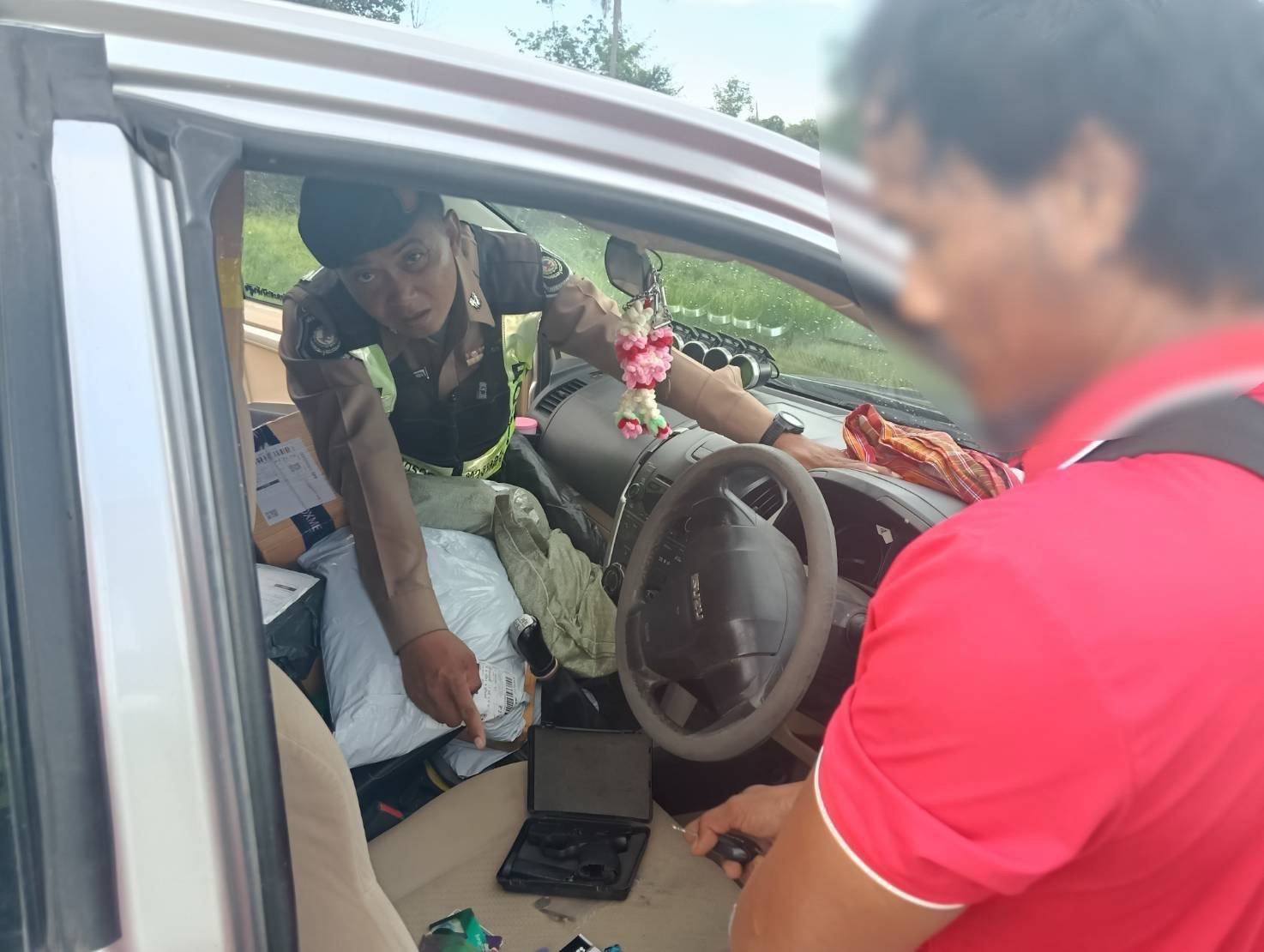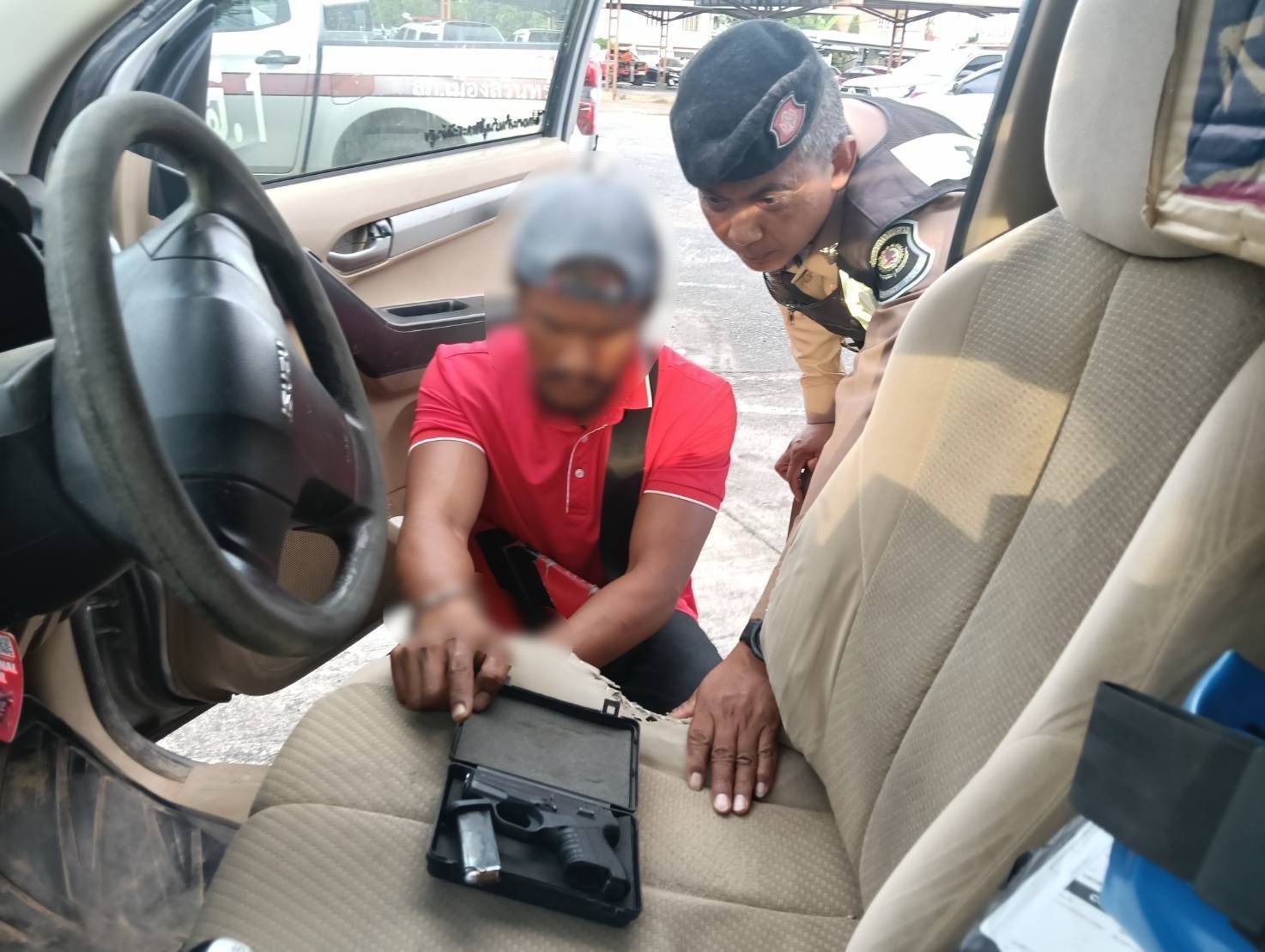 เจ้าหน้าที่ชุดจับกุมจึงได้แสดงตัวเพื่อขอตรวจสอบทราบว่าผู้ขับขี่คือ นายนัท (นามสมมุติ) อายุ 33 ปี เป็นคนผู้ขับขี่รถยนต์คันดังกล่าว ต่อมานายนัท (นามสมมุติ) อายุ 33 ปี มีอาการสั่น ตกใจ ลักษณะท่าทางมีพิรุธ เจ้าหน้าที่จึงขอตรวจค้นตัวปรากฏว่าไม่พบสิ่งของผิดกฎหมาย จึงขอตรวจค้นรถยนต์คันดังกล่าวผลการตรวจค้น พบอาวุธปืนพกสั้นชนิดออโตเมติกขนาด .380 จำนวน 1 กระบอก และเครื่องกระสุนปืนขนาด .380 จำนวน 4 นัด บรรจุอยู่ในกล่องพลาสติกสีดำซ่อนอยู่ในช่องใต้พวงมาลัย สอบถามนายนพรัตฯ รับว่าเป็นปืนที่ซื้อมาจากกลุ่มขายปืนใน facebook ซื้อมาในราคา 8,000 บาท เจ้าหน้าที่ชุดจับกุมจึงแจ้งข้อกล่าวหา ให้นายนัท (นามสมมุติ) อายุ 33 ปี ทราบ ทำบันทึกการจับกุมพร้อมทั้งแจ้งสิทธิ์ตามกฎหมาย ผู้ต้องหาให้การรับสารภาพตลอดข้อกล่าวหา จากนั้นเจ้าหน้าที่จึงได้ควบคุมตัวพร้อมของกลาง ส่งพนักงานสอบสวน สภ.เมืองสุรินทร์ เพื่อดำเนินคดีตามกฎหมายต่อไป