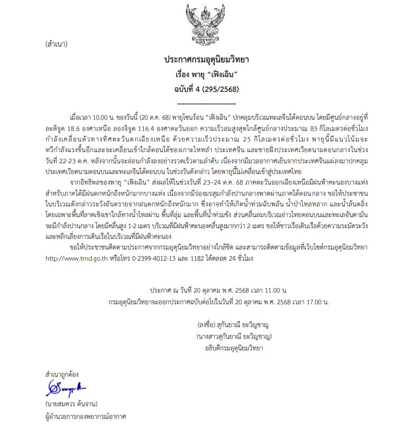 ประกาศกรมอุตุนิยมวิทยา เรื่อง พายุ “เฟิงเฉิน” ฉบับที่ 4