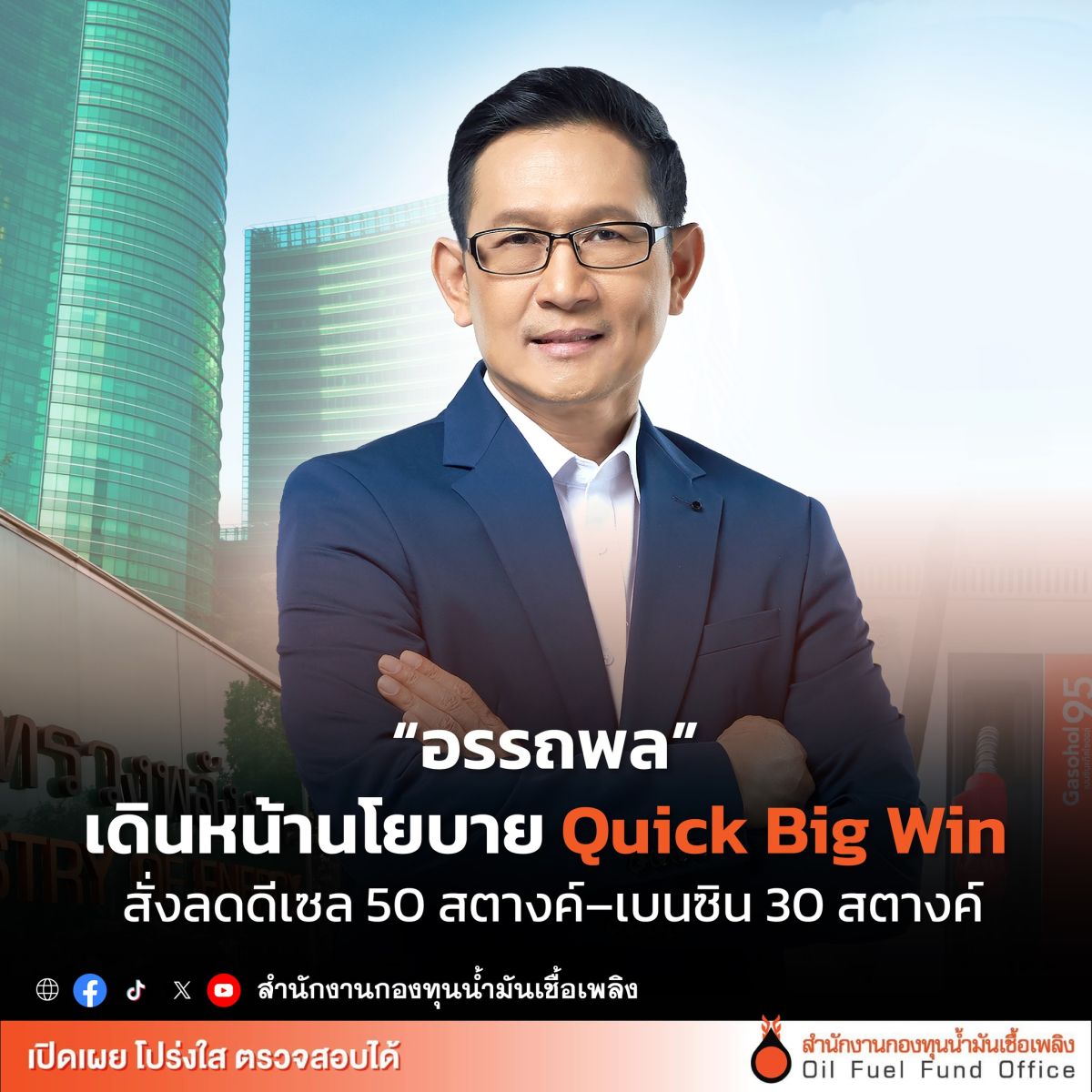 นายอรรถพล กล่าวว่า “การปรับลดราคาน้ำมันในครั้งนี้ เป็นส่วนหนึ่งของการดำเนินงานตามนโยบาย Quick Big Win ที่ให้กองทุนน้ำมันเชื้อเพลิง มุ่งสร้างผลลัพธ์เชิงรูปธรรมอย่างชัดเจน และรวดเร็ว เพื่อดูแลค่าครองชีพให้แก่ประชาชน และขับเคลื่อนเศรษฐกิจฐานรากให้เดินหน้าอย่างมั่นคง เนื่องจากพลังงานเป็นเรื่องใกล้ตัวที่ส่งผลโดยตรงต่อชีวิตความเป็นอยู่ของประชาชน ซึ่งการลดราคาดีเซลดังกล่าว นับเป็นการปรับลดต่อเนื่องจากเมื่อต้นเดือนตุลาคมที่ผ่านมา (3 ต.ค.) โดยลดราคาขายปลีกน้ำมันดีเซลลง 50 สตางค์/ลิตร จาก 31.44 บาท/ลิตร เป็น 30.94 บาท/ลิตร นอกจากนี้ยังมีการปรับลดราคาขายปลีกน้ำมันเบนซินลงทุกชนิด 30 สตางค์/ลิตร เพื่อให้ประชาชนได้รับประโยชน์โดยตรงจากการบริหารจัดการราคาพลังงานอย่างทันท่วงที ภายใต้หลักการทำงาน “เปิดเผย-โปร่งใส-ตรวจสอบได้” ของ กบน. และสำนักงานกองทุนน้ำมันเชื้อเพลิง (สกนช.) โดยมีรายละเอียดในตาราง ดังนี้