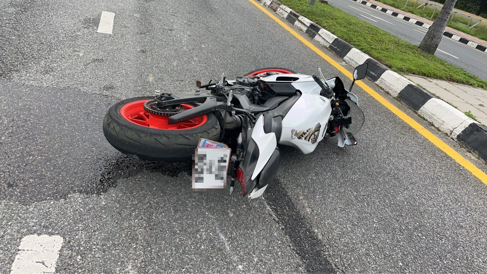 ห่างไปเล็กน้อย พบรถจักรยานยนต์ ยี่ห้อ ยามาฮ่า อาร์ 7 สีขาว หมายเลขทะเบียน ชลบุรี ล้มคว่ำสภาพรถพังเสียหาย ตรวจสอบที่หัวน็อตเสาไฟส่องสว่างยังพบร่องรอย คราบเลือด และชิ้นเนื้อของผู้เสียชีวิตติดอยู่ด้วย