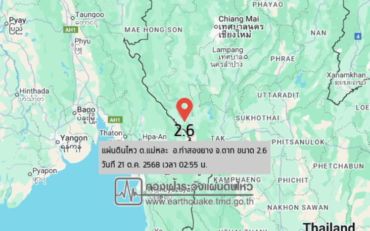 แผ่นดินไหวขนาด 2.6 ในพื้นที่ท่าสองยาง จังหวัดตาก