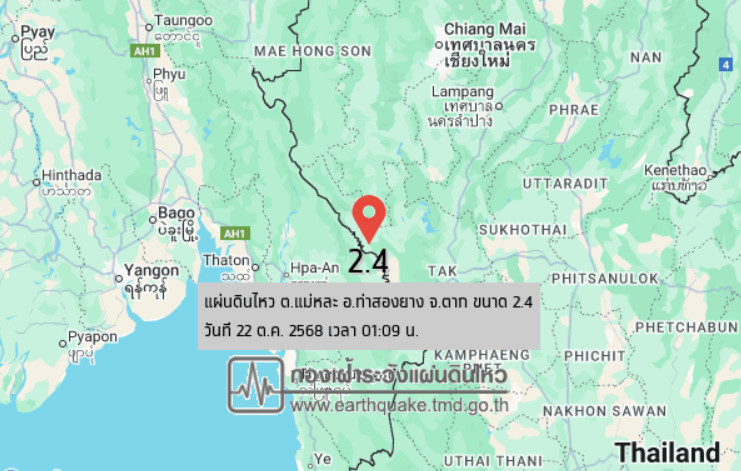 วันที่ 22 ต.ค. 2568 เวลา 01.09 น. กองเฝ้าระวังแผ่นดินไหว กรมอุตุนิยมวิทยา แจ้งเหตุแผ่นดินไหว ขนาด 2.4 ความลึก 2 กม. ภายในพื้นที่ของ ต.แม่หละ อ.ท่าสองยาง จ.ตาก (17.12°N,98.38°E) ขณะนี้ยังไม่มีรายงานการรับรู้ถึงแรงสั่นสะเทือน