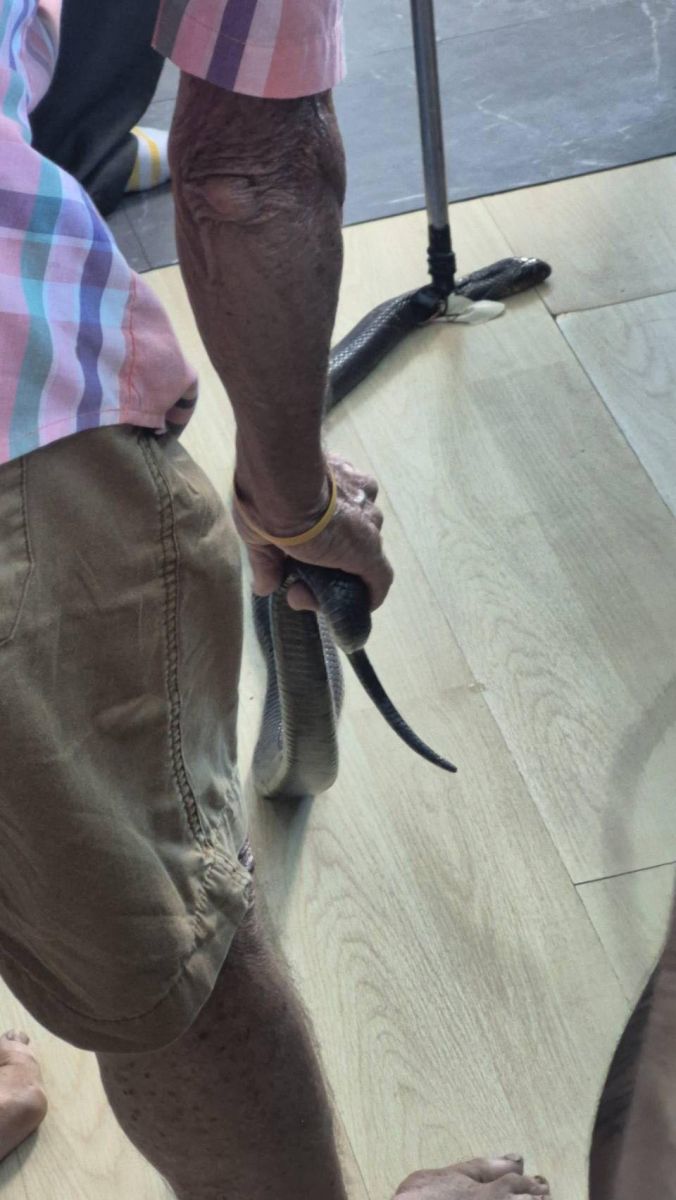 ส่วนงูเห่าคู่กรณี ตำรวจได้ประสานอาสาสมัครที่มีความเชี่ยวชาญด้านการจับงู นำอุปกรณ์มาจับงูเห่าตัวดังกล่าว ซึ่งพบว่าเป็นงูเห่าค่อนข้างตัวใหญ่ ยาวเกือบ1 เมตร