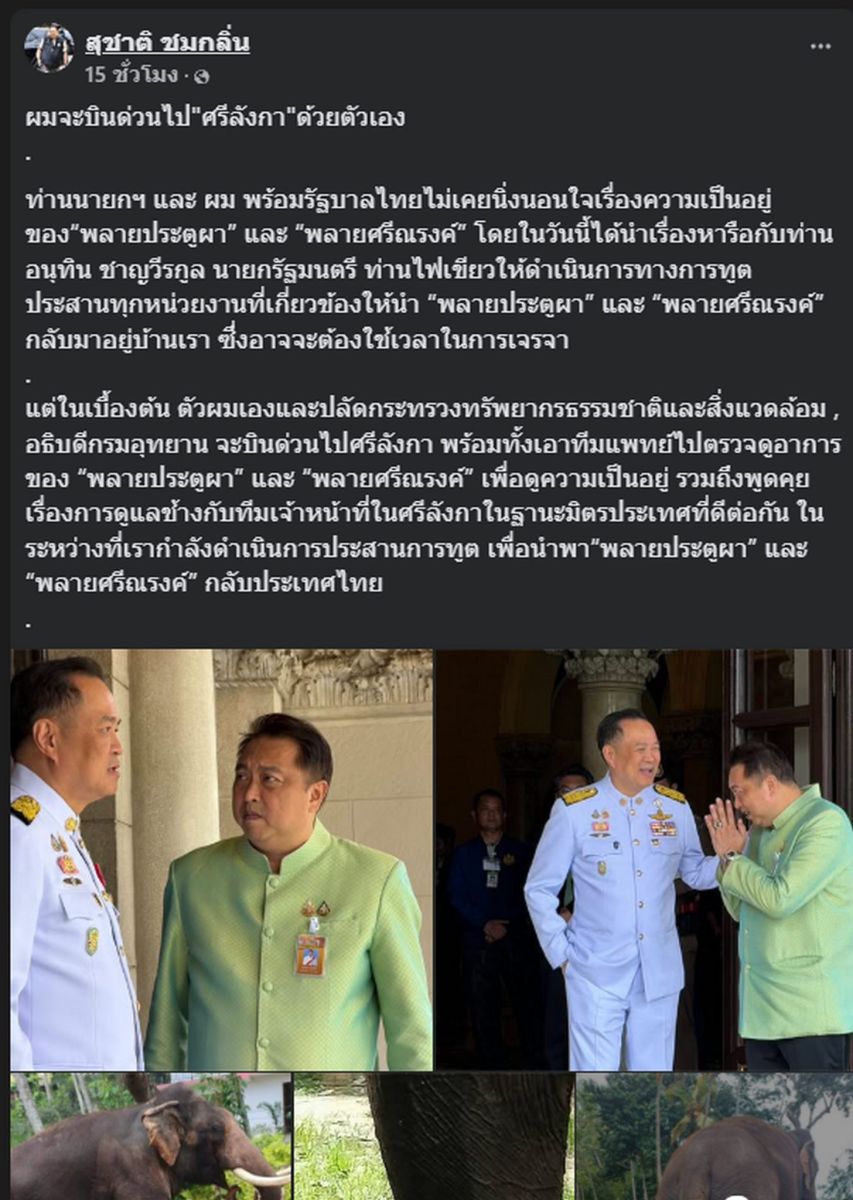 24 ตุลาคม 2568 จากกรณีมีกระแสเรียกร้องให้นำ “พลายประตูผา” และ “พลายศรีณรงค์” ช้างไทยที่ส่งไปเป็นทูตสันถวไมตรีให้ศรีลังกากลับประเทศ หลังพบว่า มีการนำไปใช้งานและมีปัญหาสุขภาพ