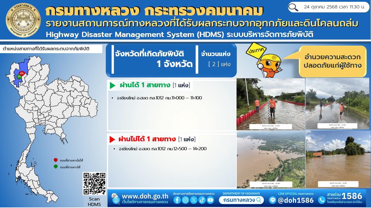 กรมทางหลวง (ทล.) กระทรวงคมนาคม สรุปสถานการณ์ล่าสุด พบการจราจรผ่านไม่ได้ในพื้นที่จังหวัดเชียงใหม่ ดังนี้