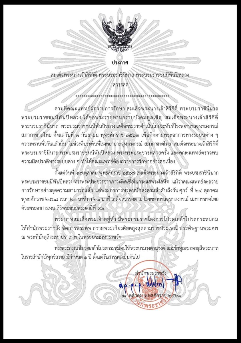 สำนักพระราชวัง เผยแพร่ประกาศ สมเด็จพระนางเจ้าสิริกิติ์ พระบรมราชินีนาถ พระบรมราชชนนีพันปีหลวง สวรรคต