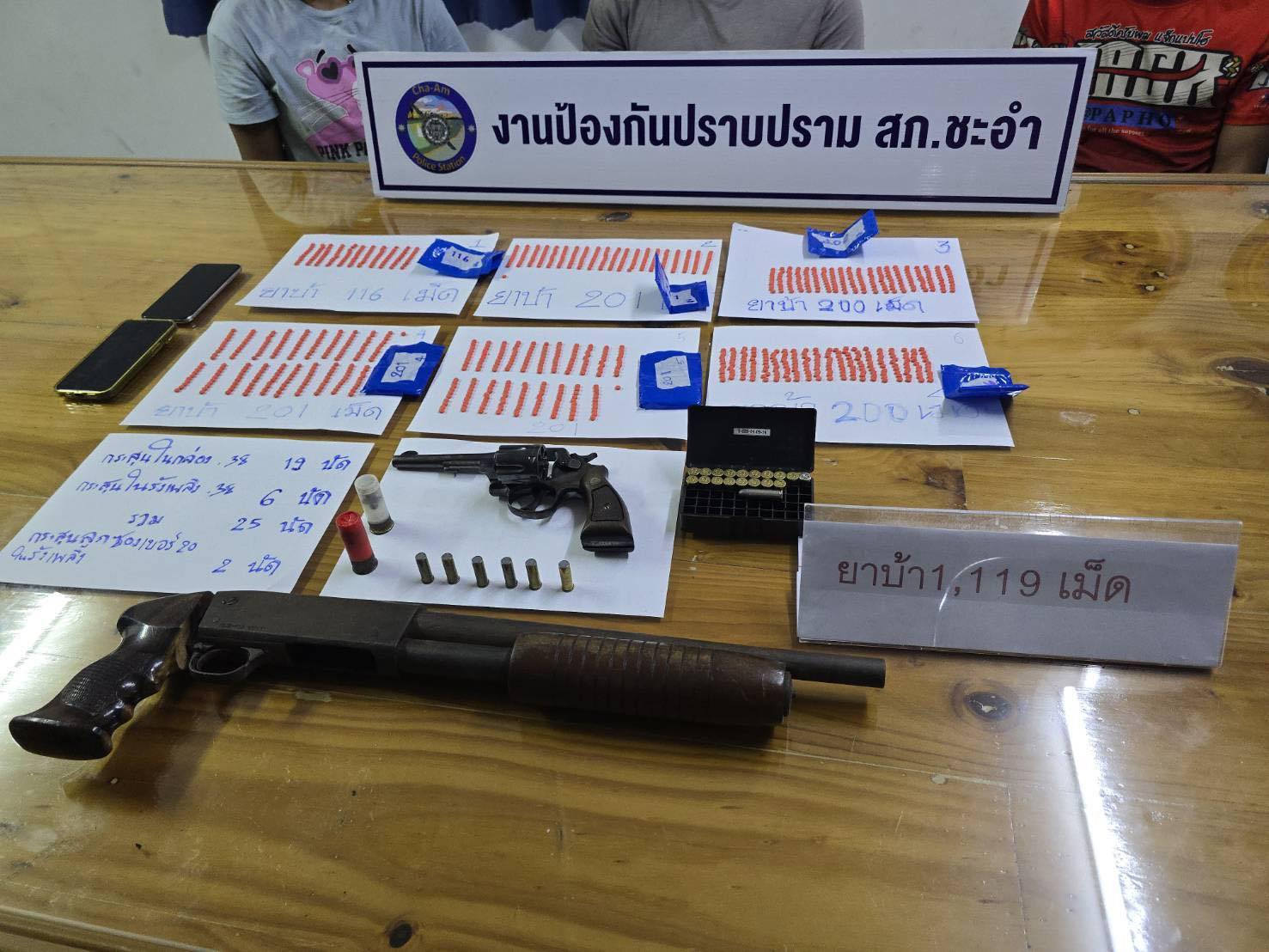 สภ.ชะอำ จับกุมผู้ต้องหา 3 ราย พร้อมของกลาง ยาบ้า 1,119 เม็ด และ อาวุธปืน 3 กระบอก