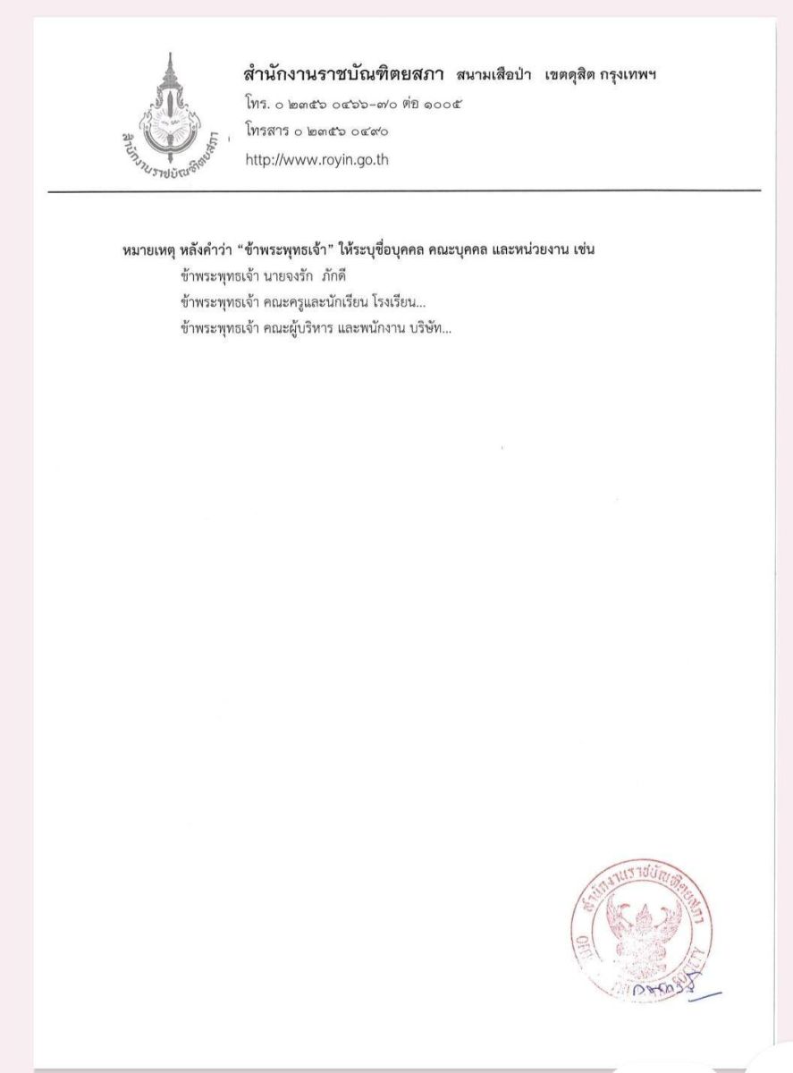 นอกจากนี้ สำนักงานราชบัณทิตยสภายังชี้แจงหลักการใช้คำว่า “ข้าพระพุทธเจ้า” ว่า ให้ระบุชื่อบุคคล คณะบุคคล และหน่วยงาน หลังคำว่า “ข้าพระพุทธเจ้า” อาทิ