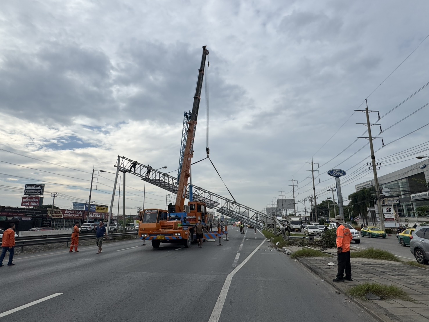ล่าสุด เวลา 11.00 น. เจ้าหน้าที่แจ้งเพิ่มเติมว่า สามารถเคลื่อนย้ายป้ายพ้นกีดขวางแล้ว เปิดการจราจรได้ตามปกติ