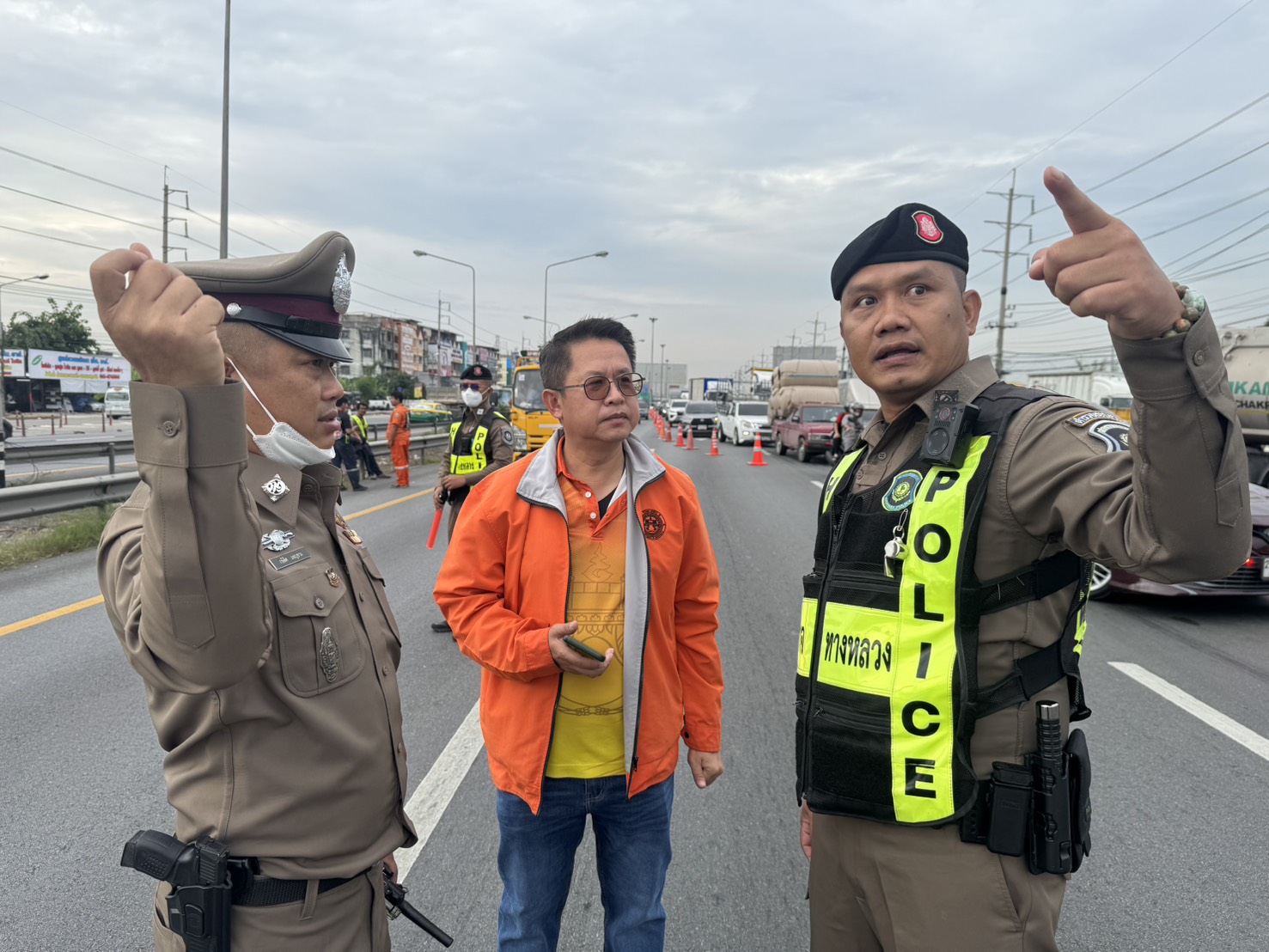 ในเวลาต่อมานายสิทธิชัย สารพรม หัวหน้าหมวดทางหลวงบางบัวทอง พร้อมด้วยเจ้าหน้าที่ตำรวจทางหลวง ลงพื้นที่ตรวจสอบเหตุพร้อมกับเตรียมนำรถเครนมายกรื้อถอนป้ายบอกทางดังกล่าวเพื่อเปิดช่องทางจราจรให้กลับมาเป็นปกติ โดยมีเจ้าหน้าที่ตำรวจทางหลวงเร่งระบายรถที่ติดสะสมจากเส้นทางหลัก เบี่ยงออกช่องทางคู่ขนานแทน