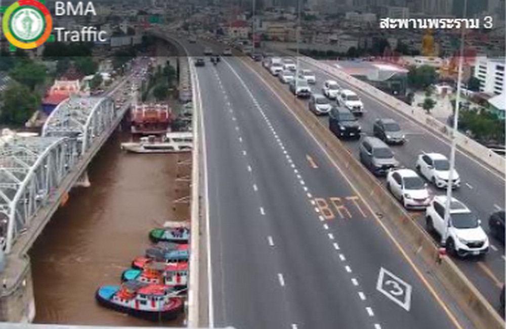 - สะพานพระราม 3 ขาเข้า ท้ายแถวสะสมอยู่ที่สะพานข้ามคลองบางกอกใหญ่