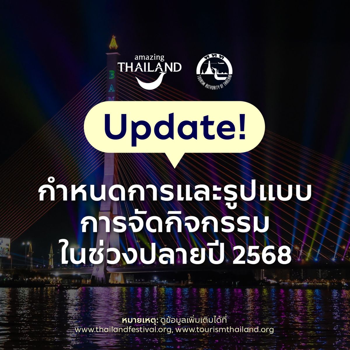 ทั้งนี้ผู้ที่สนใจสามารถติดตามรายละเอียดของกำหนดการจัดงานและกิจกรรมของ ททท. ได้ผ่านช่องทาง www.tourismthailand.org และ www.thailandfestival.org