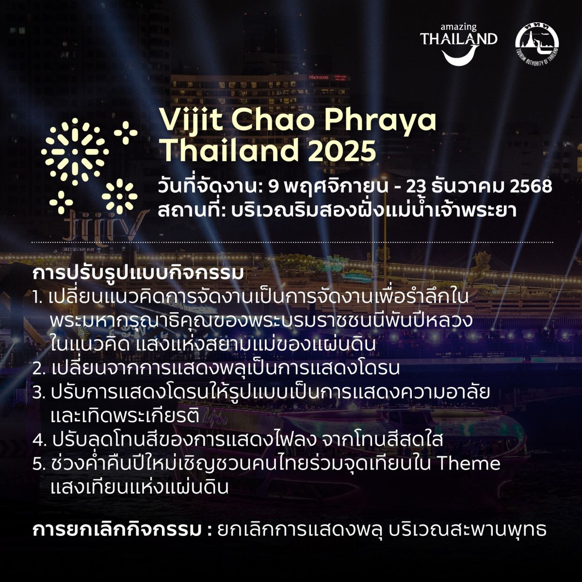 กิจกรรม VIJIT CHAOPRAYA THAILAND 2025 เลื่อนกำหนดการจัดกิจกรรมจากกำหนดเดิมในวันที่ 1 พฤศจิกายน – 15 ธันวาคม 2568 ณ บริเวณริมสองฝั่งแม่น้ำเจ้าพระยา กรุงเทพมหานคร เป็นวันที่ 9 พฤศจิกายน – 23 ธันวาคม 2568 โดยปรับรูปแบบการจัดงาน ภายใต้แนวคิดการจัดงานใหม่ เพื่อรำลึกในพระมหากรุณาธิคุณของพระบรมราชชนนีพันปีหลวง ด้วยแนวคิด “แสงแห่งสยามแม่ของแผ่นดิน” และเปลี่ยนการแสดงจากพลุเป็นการแสดงโดรน แสดงความอาลัยและเทิดพระเกียรติ รวมทั้งปรับลดโทนแสงและสีของการแสดงไฟให้เหมาะสมยิ่งขึ้น โดยในช่วงค่ำคืนปีใหม่ขอเชิญชวนประชาชนร่วมกิจกรรม “แสงเทียนแห่งแผ่นดิน” จุดเทียนรวมใจถวายเป็นพระราชกุศล