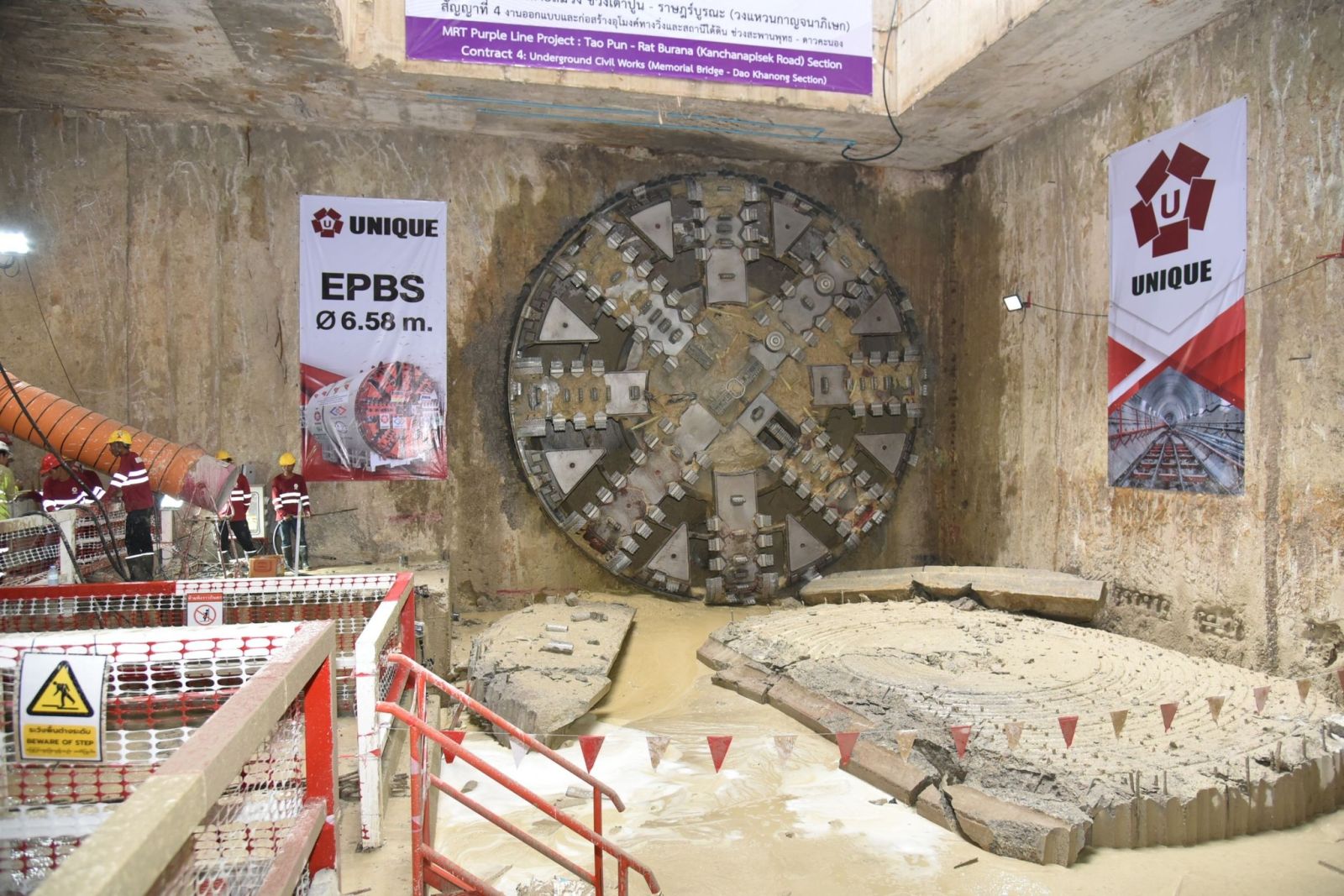 ปัจจุบัน โครงการรถไฟฟ้าสายสีม่วงฯ สัญญาที่ 4 ช่วงสะพานพุทธ - ดาวคะนอง ซึ่งมี บริษัท ยูนิค เอ็นจิเนียริ่ง แอนด์ คอนสตรัคชั่น จำกัด (มหาชน) เป็นผู้รับจ้างงานโยธา มีความคืบหน้า ณ สิ้นเดือนตุลาคม อยู่ที่ร้อยละ 63.63 สำหรับงานขุดเจาะอุโมงค์รถไฟฟ้าใต้ดิน สัญญาที่ 4 มีระยะทางทั้งสิ้น 3.3 กิโลเมตร โดยเริ่มดำเนินการขุดเจาะตั้งแต่เดือนมกราคม 2568 ที่ผ่านมา ซึ่งเมื่อหัวขุดเจาะอุโมงค์ทะลุเข้าสู่สถานีสะพานพุทธฯ แล้ว จะยกหัวขุดเจาะอุโมงค์กลับมาที่สถานีโรงพยาบาลสมเด็จพระปิ่นเกล้าอีกครั้ง เพื่อขุดเจาะไปยังบริเวณ Cut & Cover ซึ่งเป็น