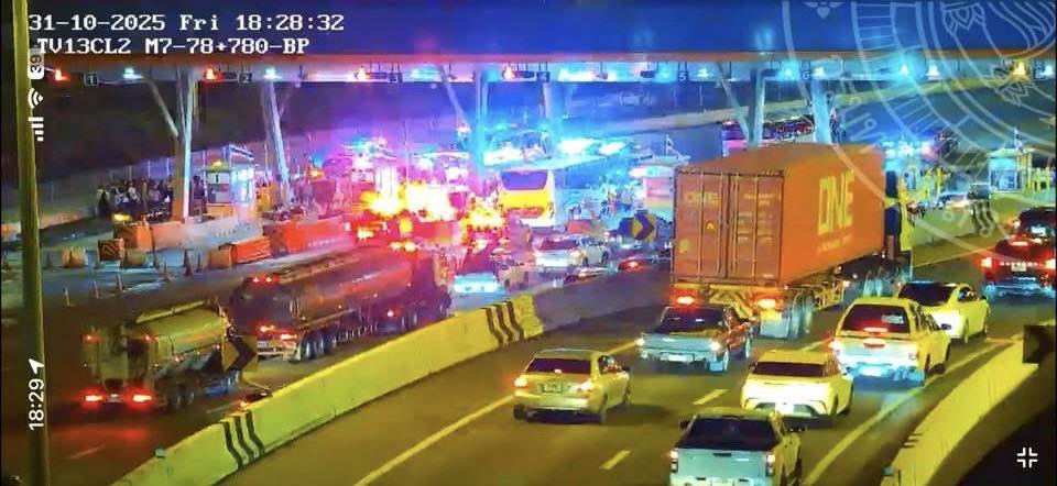 เมื่อช่วงหัวคํ่า เวลาประมาณ 18.30 น. ของวันที่ 31 ตุลาคม 2568 เจ้าหน้าที่ตำรวจและหน่วยกู้ภัยมอเตอร์เวย์ได้รับแจ้งเหตุจาก ด่านบางพระ 4 ว่ามีอุบัติเหตุรถบัสชนกันบนทางหลวงหมายเลข 7 (กรุงเทพฯ–บ้านฉาง) ช่วงกิโลเมตรที่ 79+000 มุ่งหน้าบ้านฉาง