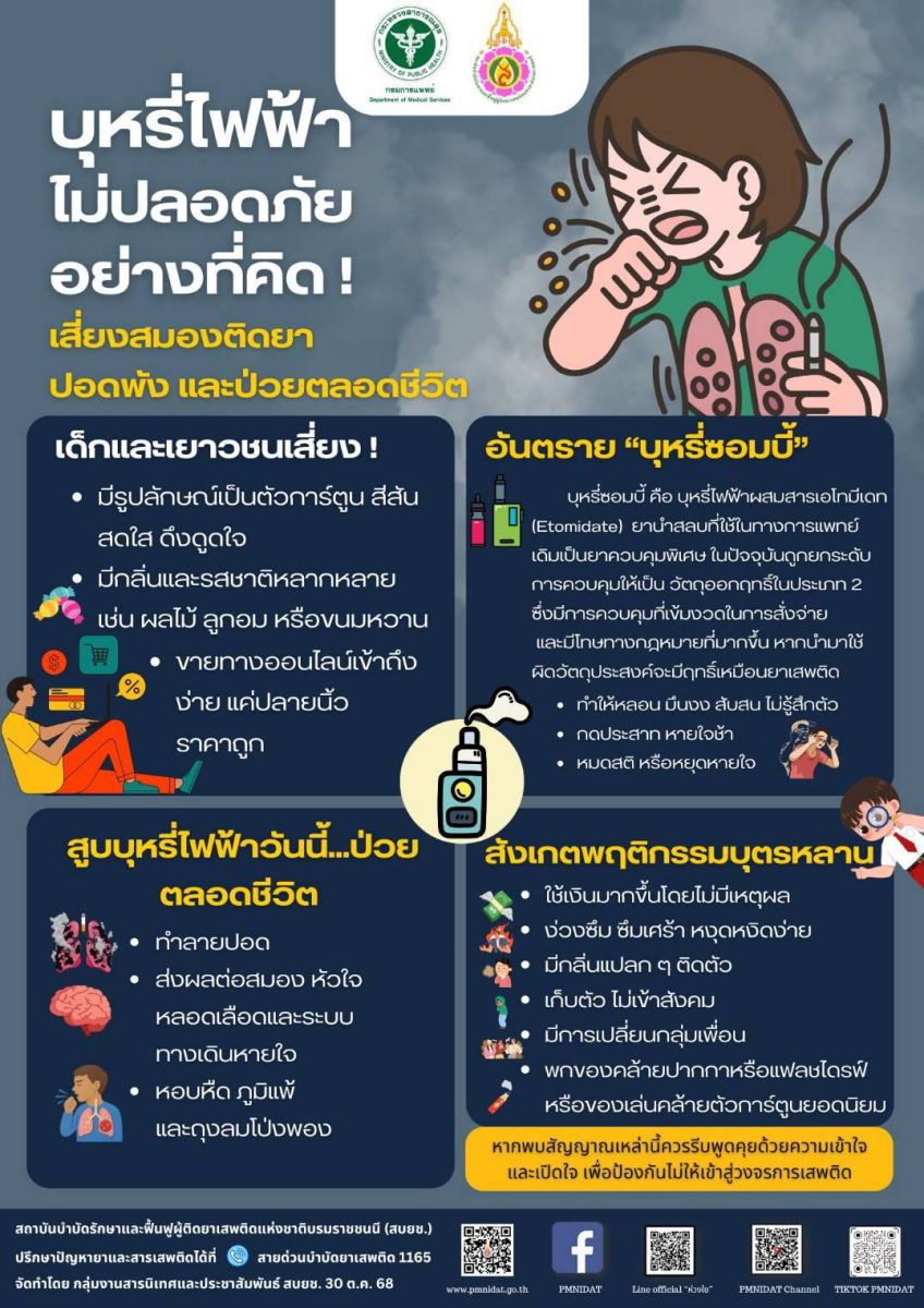 นายแพทย์สกานต์ บุนนาค รองอธิบดีกรมการแพทย์ กล่าวว่า ปัจจุบันบุหรี่ไฟฟ้าแพร่ระบาดอย่างรวดเร็ว โดยเฉพาะในกลุ่มเยาวชน เนื่องจากมีการจำหน่ายอย่างกว้างขวางผ่านช่องทางออนไลน์ ทั้งในแพลตฟอร์มโซเชียลมีเดียและแอปพลิเคชันต่างๆ ในราคาที่ถูกลงและหาซื้อได้ง่าย ทำให้เด็กและเยาวชนเข้าถึงได้เพียงปลายนิ้ว รวมถึงมีรูปลักษณ์เป็นตัวการ์ตูน สีสันสดใส ดึงดูดใจ มีกลิ่นและรสชาติหลากหลาย เช่น ผลไม้ ลูกอม หรือขนมหวาน บุหรี่ไฟฟ้าไม่ใช่ทางเลือกที่ปลอดภัยอย่างที่หลายคนเข้าใจ ถึงแม้จะไม่มีควันจากการเผาไหม้เหมือนบุหรี่มวน แต่ไอระเหยของบุหรี่ไฟฟ้าเต็มไปด้วยสารเคมีอันตรายหลายชนิด โดยเฉพาะ นิโคติน (Nicotine) ซึ่งเป็นสารเสพติดที่ส่งผลต่อสมองโดยตรง ทำให้เกิดภาวะสมองติดยาเช่นเดียวกับผู้เสพเฮโรอีนหรือยาบ้า อีกทั้งน้ำยาบุหรี่ไฟฟ้ายังมักมีสารแต่งกลิ่นและรสที่ช่วยกระตุ้นความพึงพอใจ ยิ่งเพิ่มโอกาสในการเสพติดมากขึ้น นอกจากนี้ยังพบการลักลอบจำหน่ายบุหรี่ไฟฟ้าที่มีการผสมสารเอโทมีเดท (Etomidate) ยานำสลบที่ใช้ในทางการแพทย์ หรือที่รู้จักในชื่อ “บุหรี่ซอมบี้”ซึ่งการผสมสารดังกล่าวทำให้ผู้สูบเกิดอาการหลอน มึนงง สับสน ไม่รู้สึกตัวและมีอันตรายร้ายแรงต่อชีวิต การสูบบุหรี่ไฟฟ้าไม่เพียงทำลายปอดเท่านั้น แต่ยังส่งผลกระทบต่อหลอดเลือด สมอง หัวใจ และระบบทางเดินหายใจ ทำให้เสี่ยงต่อโรคหอบหืด ภูมิแพ้ และโรคถุงลมโป่งพองได้ในระยะยาว ขอย้ำเตือนเยาวชนและประชาชนทั่วไป อย่าหลงเชื่อคำชวนจากเพื่อนหรือสื่อออนไลน์ที่อ้างว่าบุหรี่ไฟฟ้าปลอดภัย เพราะการลองเพียงครั้งเดียวอาจเป็นจุดเริ่มต้นของการเสพติด