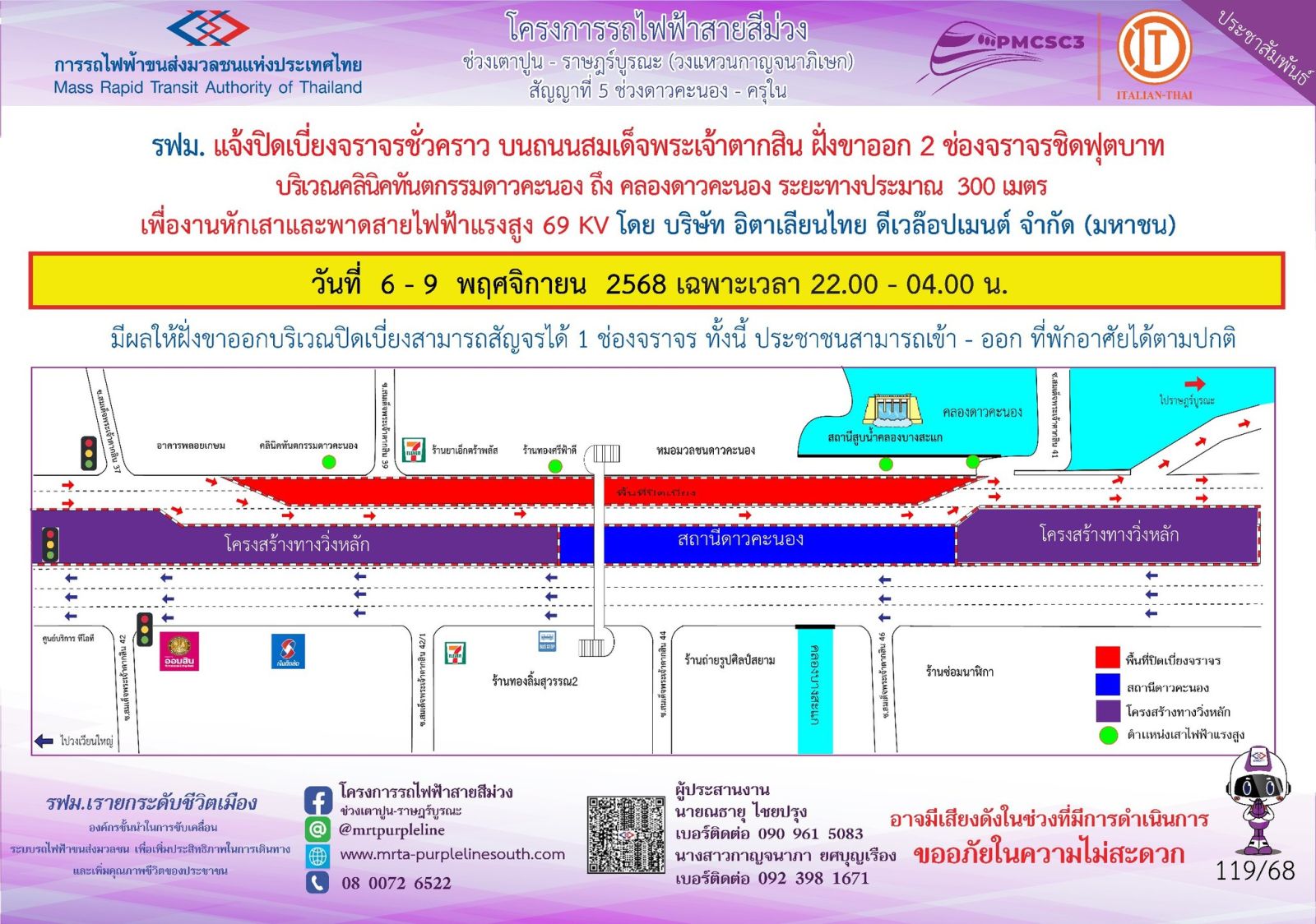 การรถไฟฟ้าขนส่งมวลชนแห่งประเทศไทย (รฟม.) แจ้งว่า บริษัท อิตาเลียนไทย ดีเวล๊อปเมนต์ จำกัด (มหาชน) ผู้รับจ้างงานก่อสร้างทางวิ่งและสถานียกระดับ อาคารจอดรถไฟฟ้าและอาคารจอดแล้วจร โครงการรถไฟฟ้าสายสีม่วง ช่วงเตาปูน - ราษฎร์บูรณะ (วงแหวนกาญจนาภิเษก) สัญญาที่ 5 ช่วงดาวคะนอง - ครุใน มีความจำเป็นต้องปิดเบี่ยงจราจรชั่วคราว บนถนนสมเด็จพระเจ้าตากสิน ฝั่งขาออก 2 ช่องจราจร ชิดฟุตบาท บริเวณคลินิคทันตกรรมดาวคะนอง ถึง คลองดาวคะนอง ระยะทางประมาณ 300 เมตร เพื่องานหักเสาและพาดสายไฟฟ้าแรงสูง 69 kV ในวันที่ 6 - 9 พฤศจิกายน 2568 เฉพาะเวลา 22.00 - 04.00 น. โดยมีผลให้ฝั่งขาออกบริเวณปิดเบี่ยงสามารถสัญจรได้ 1 ช่องจราจร ทั้งนี้ ประชาชนสามารถเข้า - ออก ที่พักอาศัยได้ตามปกติ