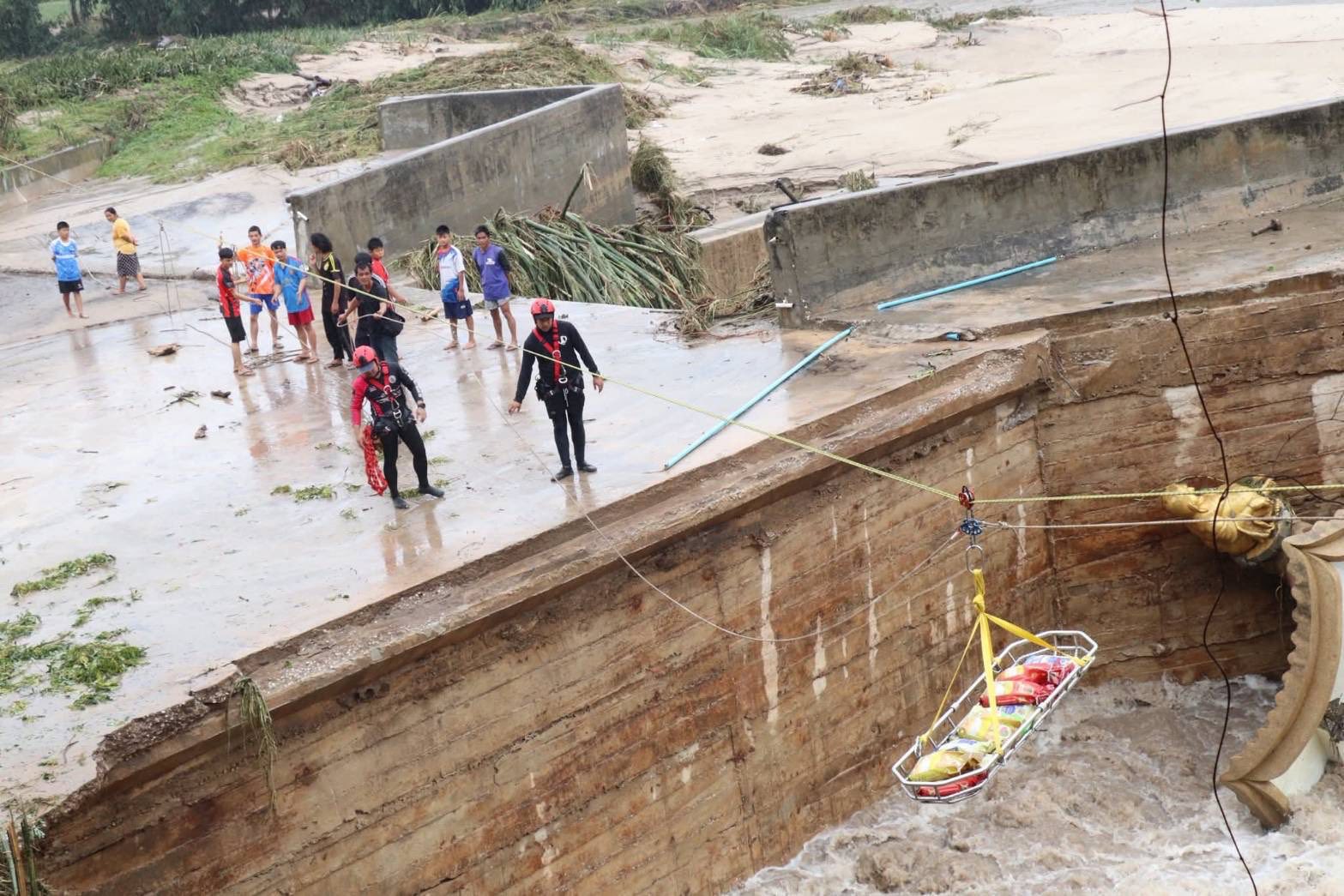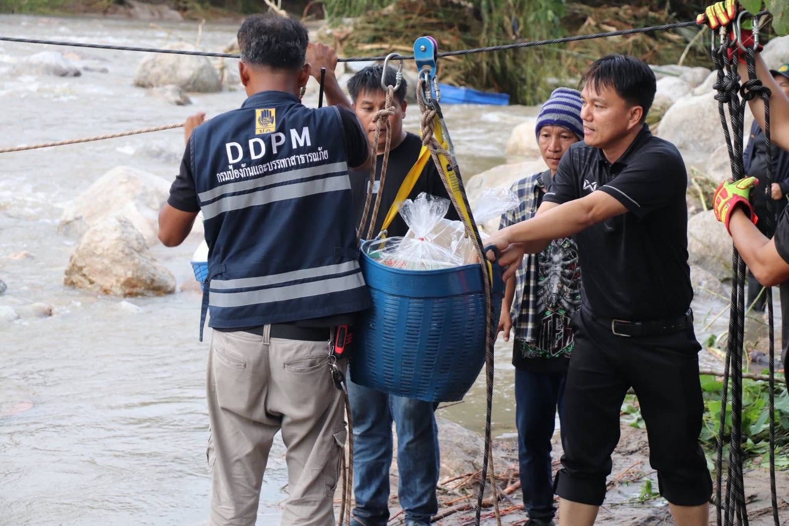 อุทัยธานีอ่วม น้ำป่าไหลหลากตัดขาด 2 หมู่บ้านกระเหรี่ยง เจ้าหน้าต้องโหนสลิงข้ามฝายเพื่อเข้าไปส่งอาหาร