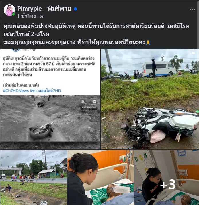ล่าสุด เพจเฟซบุ๊ก Pimrypie – พิมรี่พาย ได้โพสต์ อัปเดตอาการพ่อ ระบุว่า “คุณพ่อของพิมประสบอุบัติเหตุ ตอนนี้ท่านได้รับการผ่าตัดเรียบร้อยดี และมีโรคเซอร์ไพรส์ 2-3โรค ขอบคุณทุกๆคนและทุกๆอย่าง ที่ทำให้คุณพ่อรอดชีวิตนะคะ”