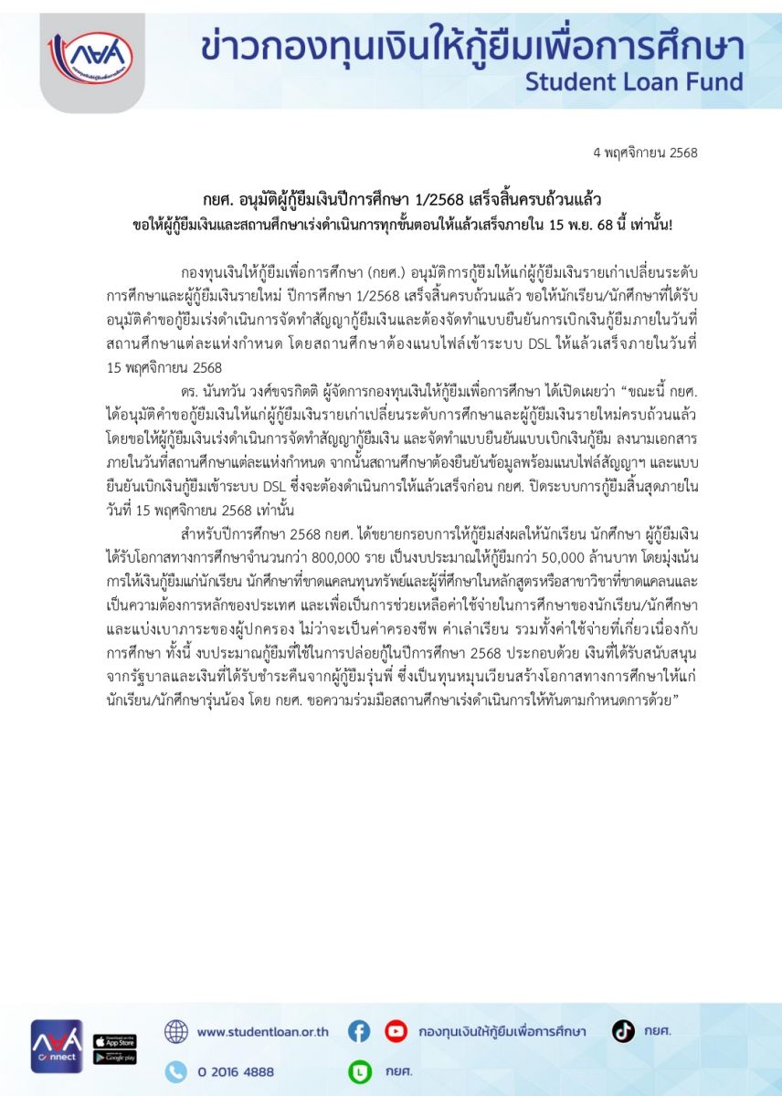 กองทุนเงินให้กู้ยืมเพื่อการศึกษา (กยศ.) อนุมัติการกู้ยืมให้แก่ผู้กู้ยืมเงินรายเก่าเปลี่ยนระดับการศึกษาและผู้กู้ยืมเงินรายใหม่ ปีการศึกษา 1/2568 เสร็จสิ้นครบถ้วนแล้ว ขอให้นักเรียน/นักศึกษาที่ได้รับอนุมัติคำขอกู้ยืมเร่งดำเนินการจัดทำสัญญากู้ยืมเงินและต้องจัดทำแบบยืนยันการเบิกเงินกู้ยืมภายในวันที่สถานศึกษาแต่ละแห่งกำหนด โดยสถานศึกษาต้องแนบไฟล์เข้าระบบ DSL ให้แล้วเสร็จภายในวันที่ 15 พฤศจิกายน 2568