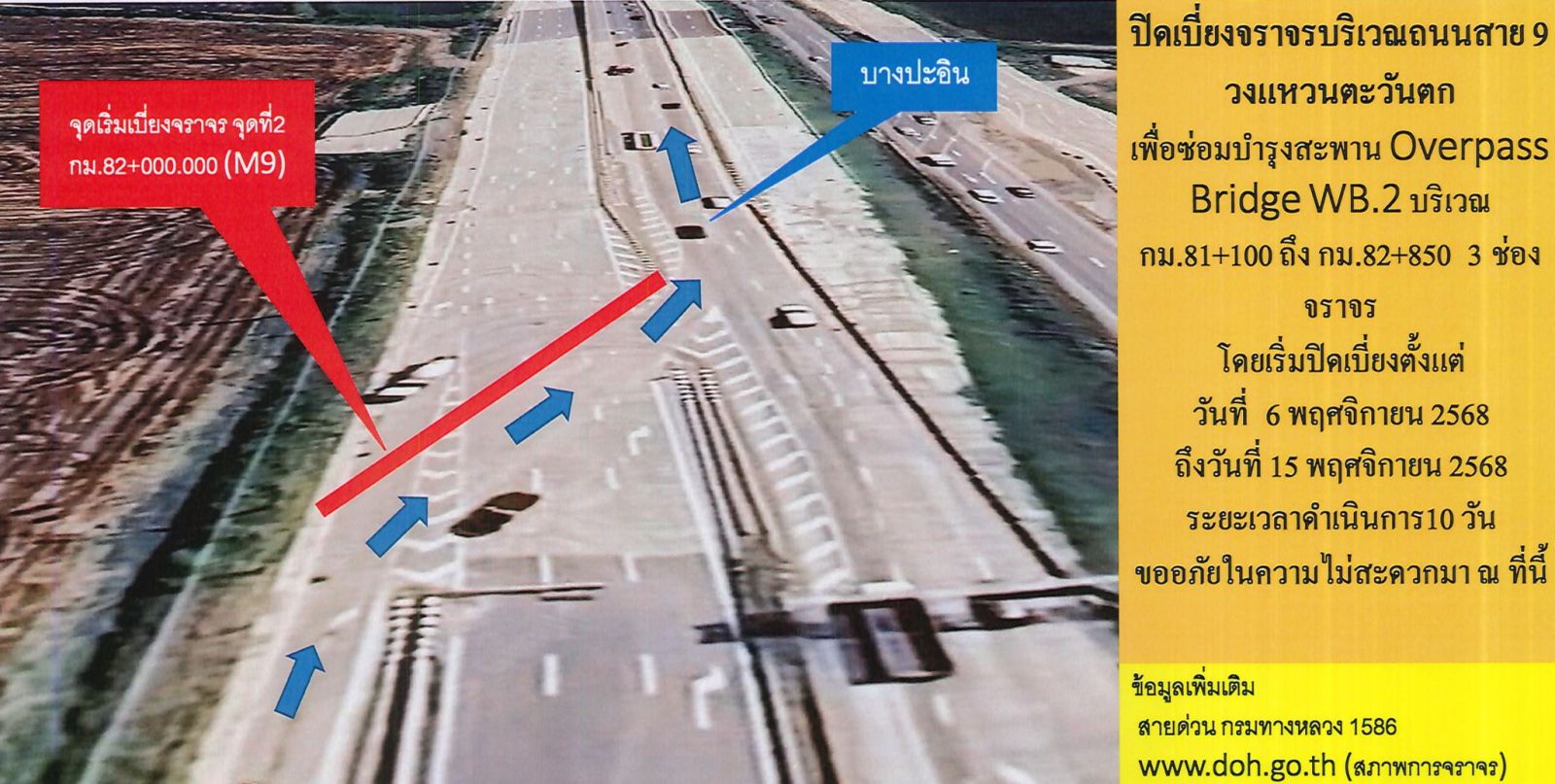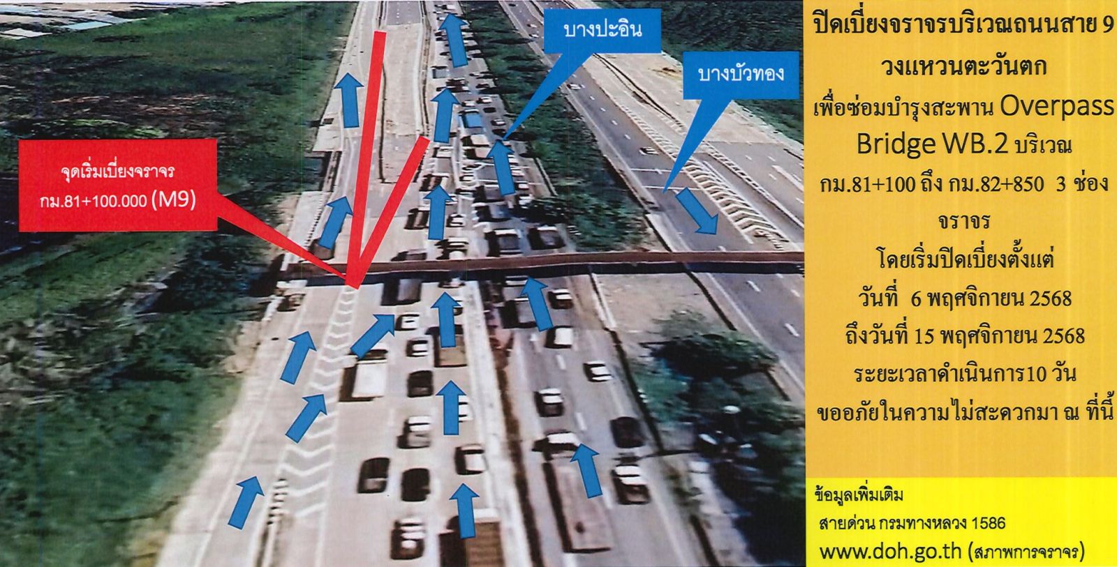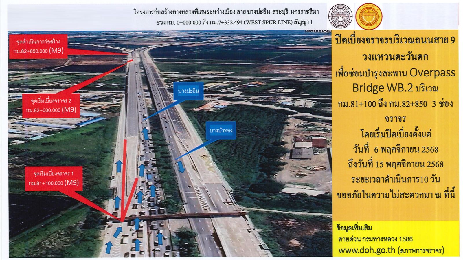 5 พ.ย.2568 แขวงทางหลวงปทุมธานี กรมทางหลวง ประชาสัมพันธ์ปิดเบี่ยงการจราจร เพื่อซ่อมแซม ถนนทางขึ้นสะพาน Overpass Bridge WB2 ด้วยโครงการก่อสร้างทางหลวงพิเศษระหว่างเมือง สายบางปะอิน - สระบุรี – นครราชสีมาจะดำเนินการซ่อมแซม ถนนทางขึ้นสะพาน Overpass Bridge WB2 บริเวณทางหลวงหมายเลข 3901 ช่วง กม.81+100 - กม.82+850 3 ช่องจราจร โดยจะดำเนินการปิดเบี่ยงในวันพฤหัสบดี ที่ 6 พฤศจิกายน 2568 - วันเสาร์ที่ 15 พฤศจิกายน 2568 (ตลอดระยะเวลาต่อเนื่องเป็นเวลา 10 วัน)