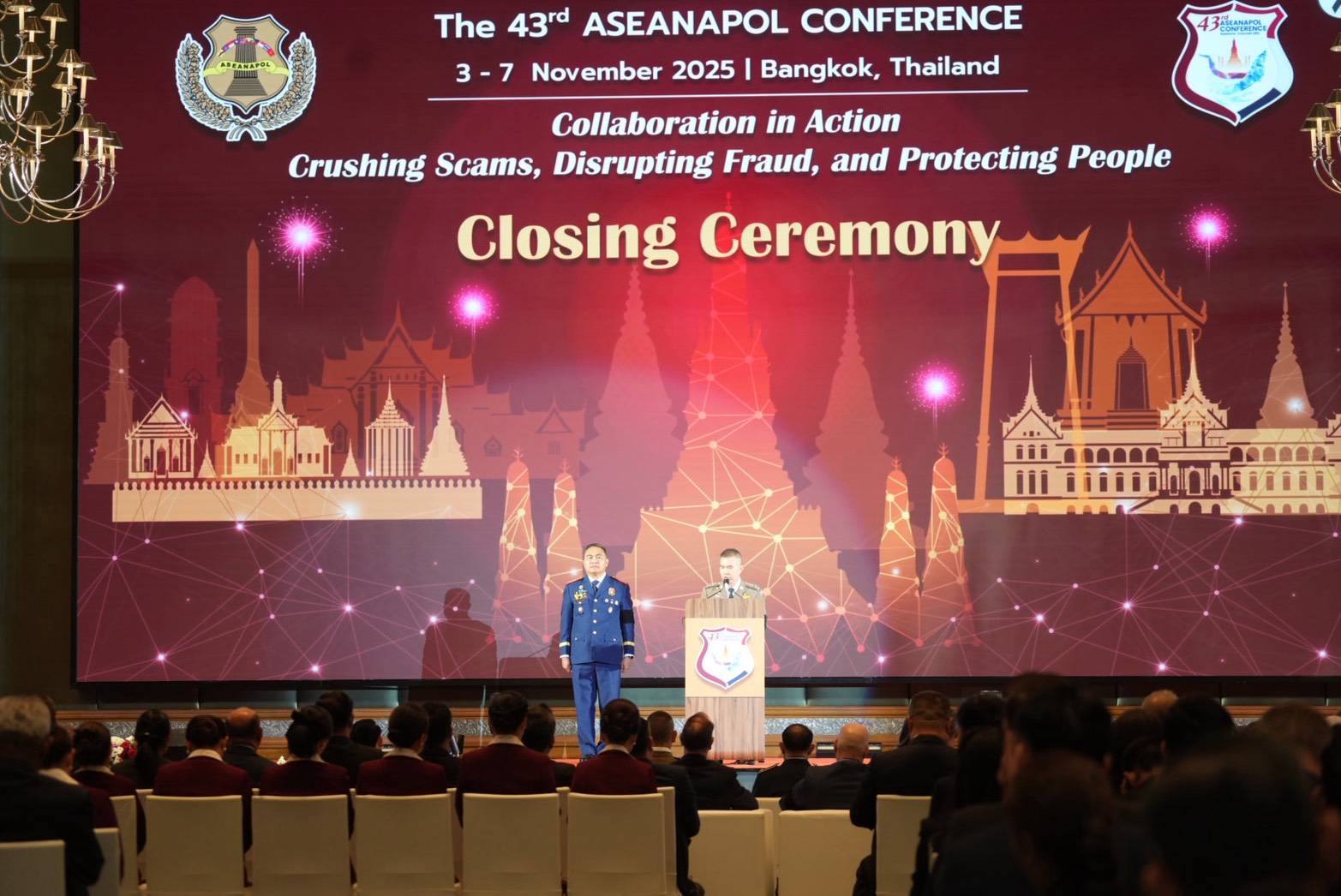 การประชุมหัวหน้าตำรวจอาเซียน ครั้งที่ 43 (The 43rd ASEANAPOL CONFERENCE) ภายใต้หัวข้อ "ปฏิบัติการร่วมกันทลายแก๊งหลอกลวง ขัดขวางการฉ้อโกง และปกป้องประชาชน" (Collaboration in Action Crushing Scams, Disrupting Fraud and Protecting People) จัดขึ้นที่กรุงเทพมหานคร ประเทศไทย ระหว่างวันที่ 3 – 7 พฤศจิกายน 2568 เพื่อเป็นเกียรติและเสริมสร้างความร่วมมืออันยาวนานระหว่างประเทศสมาชิกอาเซียนนาโปล (ASEANAPOL) ได้แก่ บรูไนดารุสซาลาม, กัมพูชา, อินโดนีเซีย, สาธารณรัฐประชาธิปไตยประชาชนลาว, มาเลเซีย, เมียนมา, ฟิลิปปินส์, สิงคโปร์, ไทย และเวียดนาม, คู่เจรจา ผู้สังเกตการณ์ และหน่วยงานอื่น ๆ ที่เกี่ยวข้องในการต่อสู้กับอาชญากรรมเพื่อรักษาไว้ซึ่งสันติภาพและความสงบเรียบร้อยของประชาชน อันเป็นรากฐานสำหรับความมั่นคงที่ยั่งยืนและการเติบโตทางเศรษฐกิจในภูมิภาค และเพื่อเสริมสร้างความมุ่งมั่นร่วมกันต่อไปสู่การเป็นภูมิภาคเอเชียตะวันออกเฉียงใต้ที่ปลอดภัยและมั่นคงยิ่งขึ้น