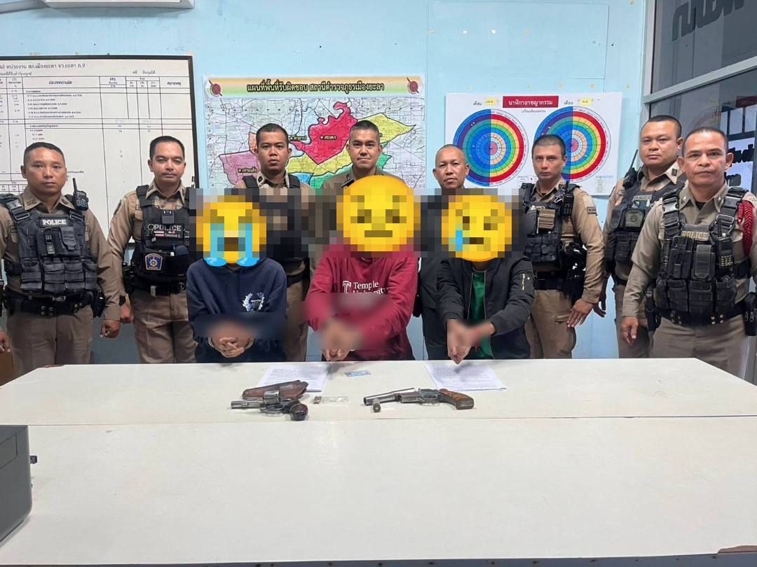 จากการตรวจค้น พบอาวุธปืนพกสั้น ยี่ห้อ Smith & Wesson ขนาด .38 จำนวน 1 กระบอก อาวุธปืนลูกซองสั้น (ไทยประดิษฐ์) จำนวน 1 กระบอก กระสุนปืนลูกซองเบอร์ 12 จำนวน 1 นัด กระสุนปืนขนาด .38 จำนวน 2 นัด เจ้าหน้าที่จึงได้ควบคุมตัวผู้ต้องหาทั้ง 3 ราย เป็นชายไทย อายุ 15, 18 และ 19 ปี