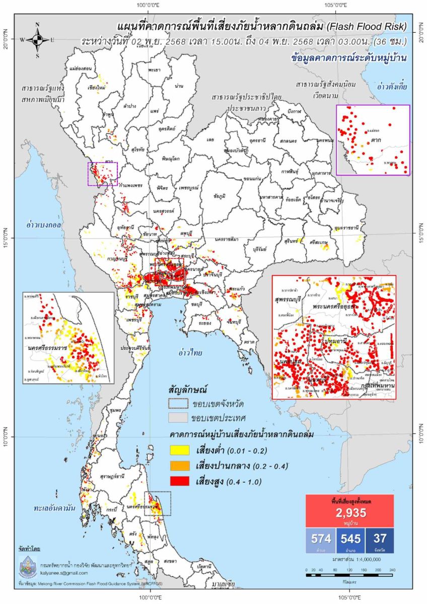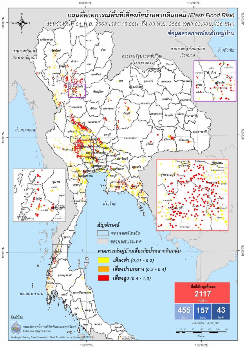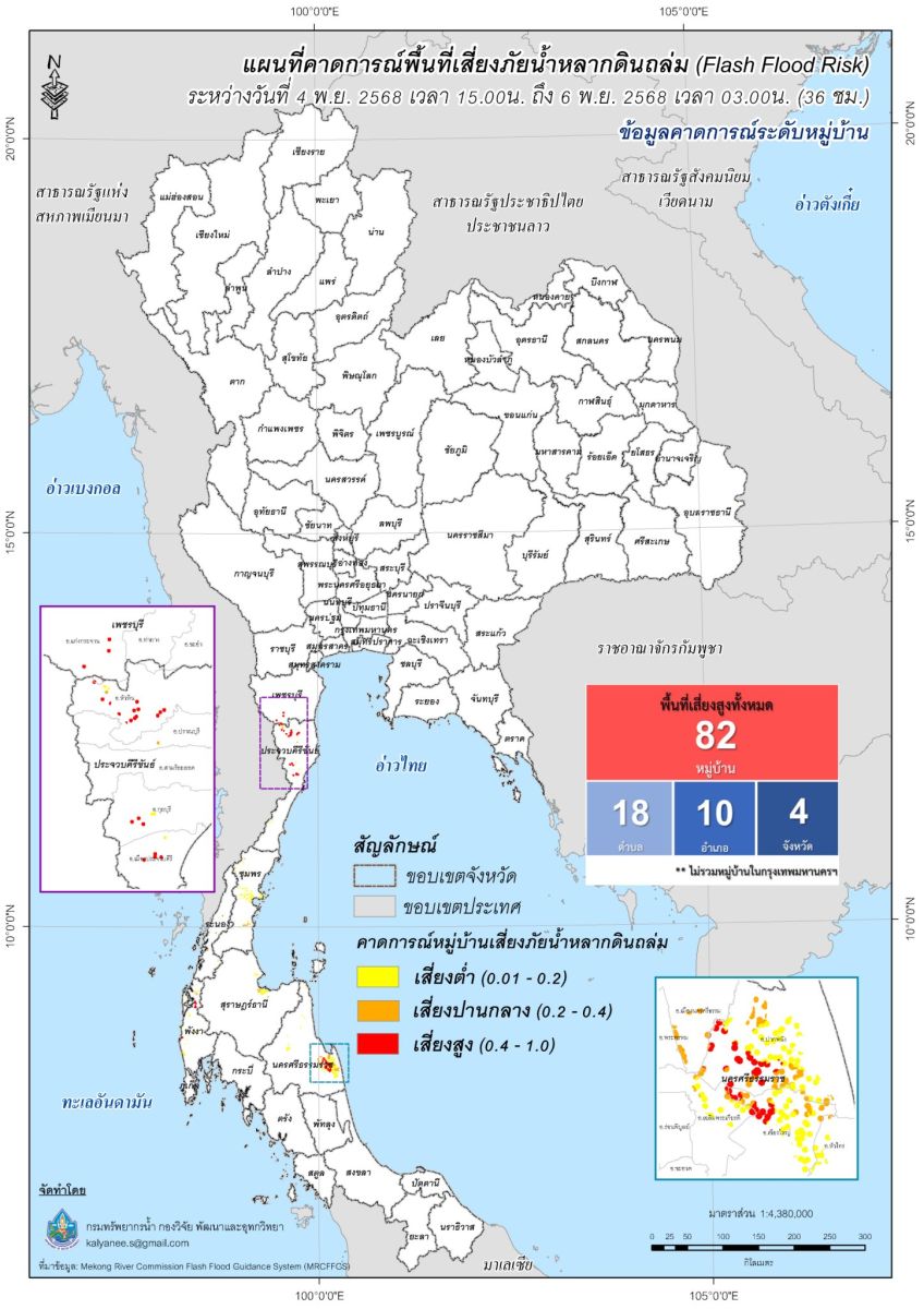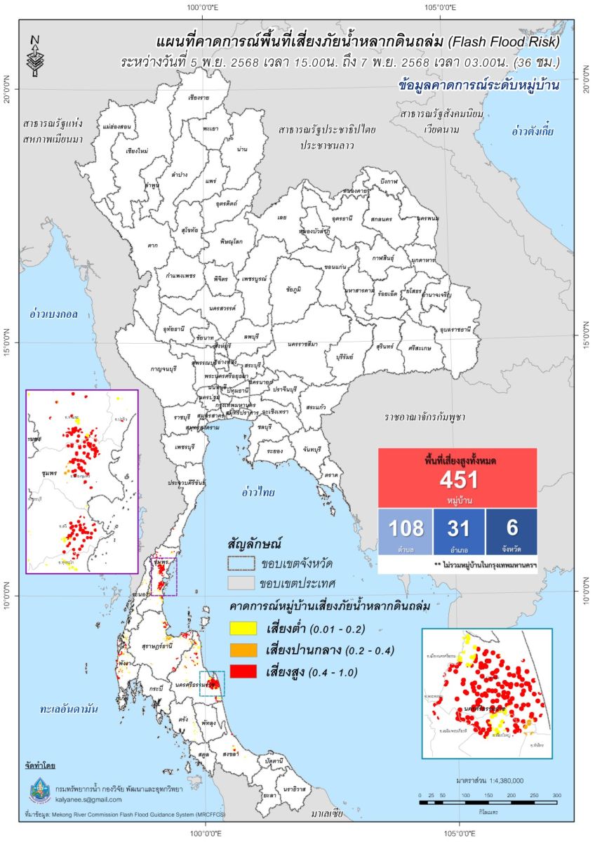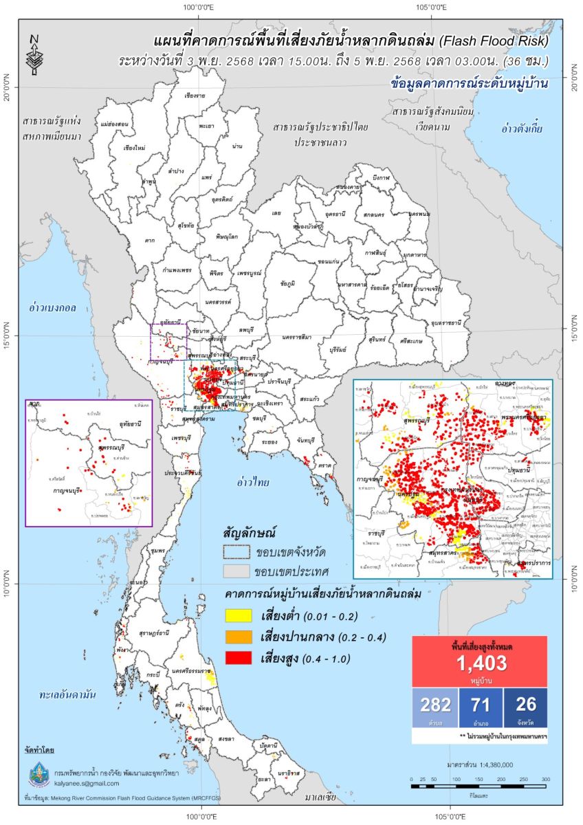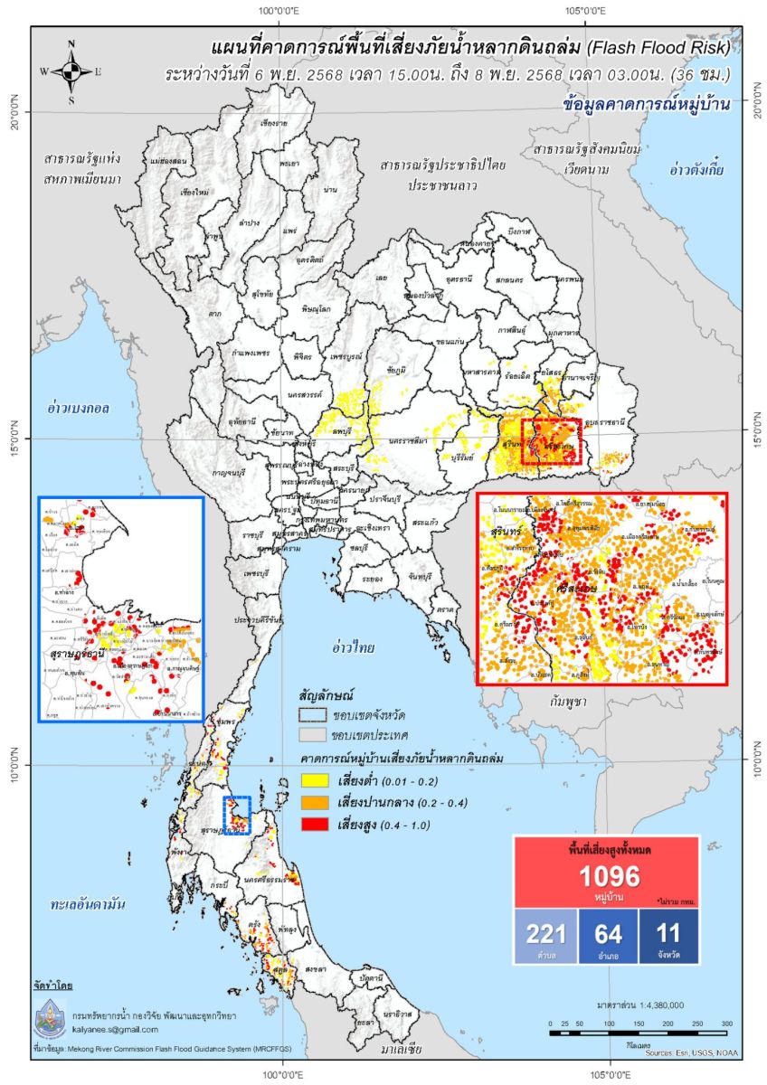 กองวิจัย พัฒนาและอุทกวิทยา แสดงแผนที่คาดการณ์พื้นที่เสี่ยงภัยน้ำหลากดินถล่ม (Flash Flood Risk) ระหว่างวันที่ 1 - 8 พฤศจิกายน 2568
