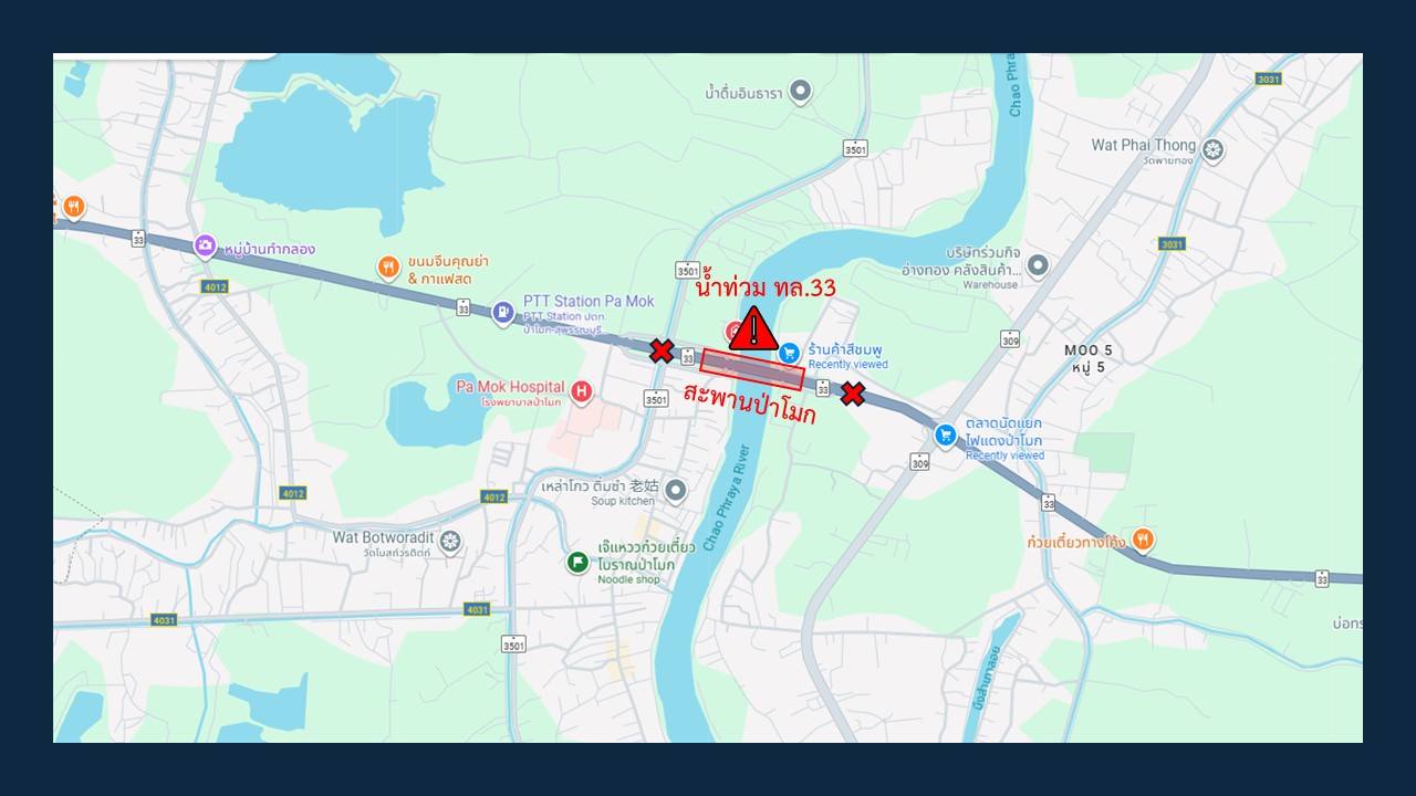 7 พ.ย.68 ปิดเส้นทางน้ำท่วม ทางหลวงหมายเลข 33 (อ่างทอง–สุพรรณบุรี) บริเวณ สะพานป่าโมก อำเภอป่าโมก จังหวัดอ่างทอง