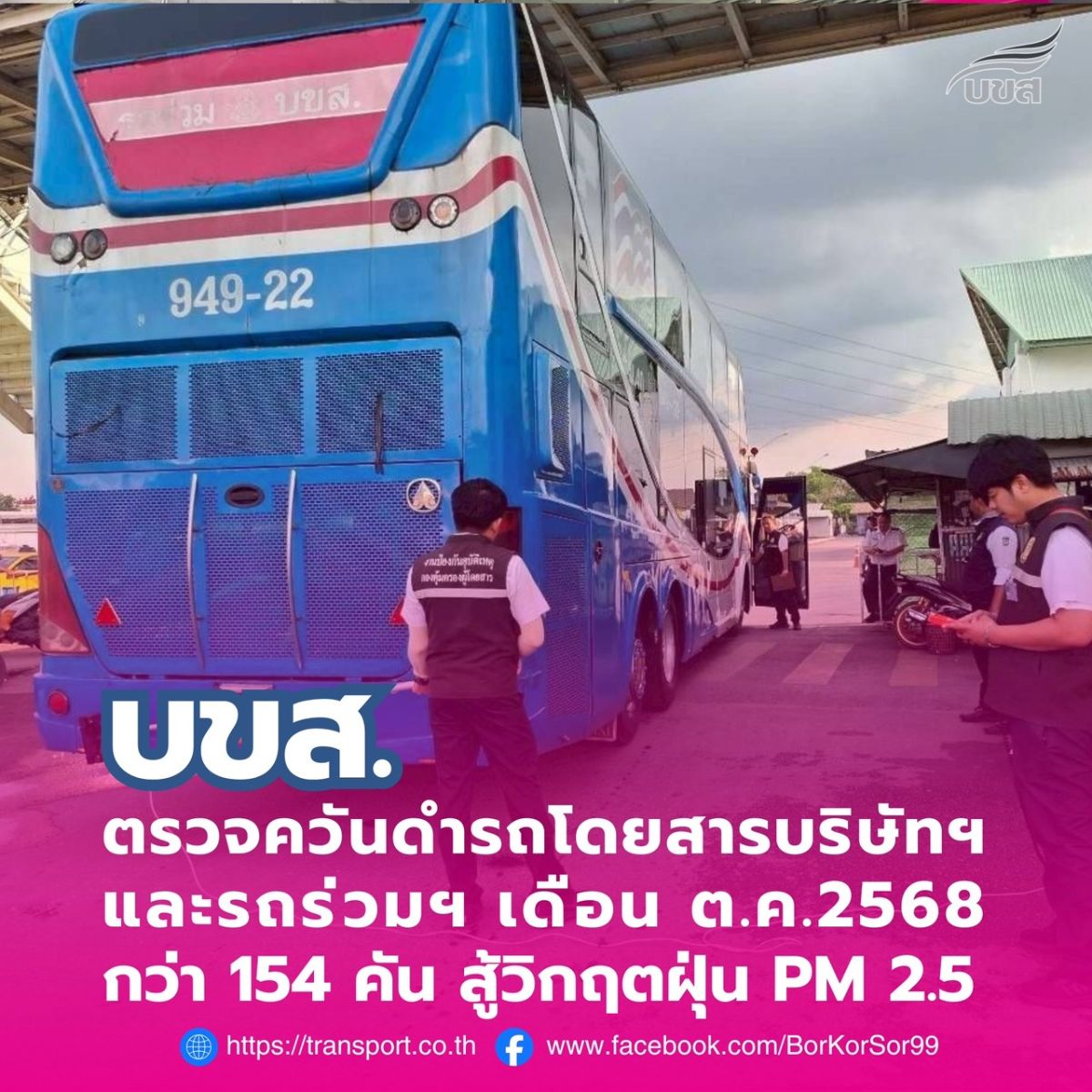 นายอรรถวิท รักจำรูญ กรรมการผู้จัดการใหญ่ บริษัท ขนส่ง จำกัด (บขส.) เปิดเผยว่า ขณะนี้ประเทศเข้าสู่ฤดูหนาว ทำให้ในพื้นที่กรุงเทพฯ และปริมณฑล เริ่มเผชิญกับปัญหาฝุ่นละอองขนาดเล็ก PM 2.5 บขส. จึงให้ความสำคัญในการแก้ไขปัญหาดังกล่าวที่เกิดจากภาคการคมนาคมขนส่งสาธารณะ ในฐานะที่เป็นผู้ประกอบการเดินรถโดยสารเส้นทางภายในประเทศ และระหว่างประเทศ รวมทั้งกำกับดูแลรถโดยสารร่วมบริการฯ จำนวน 6,300 คัน เพื่อลดผลกระทบต่อปัญหาสุขภาพของประชาชน ตามนโยบายของกระทรวงคมนาคม