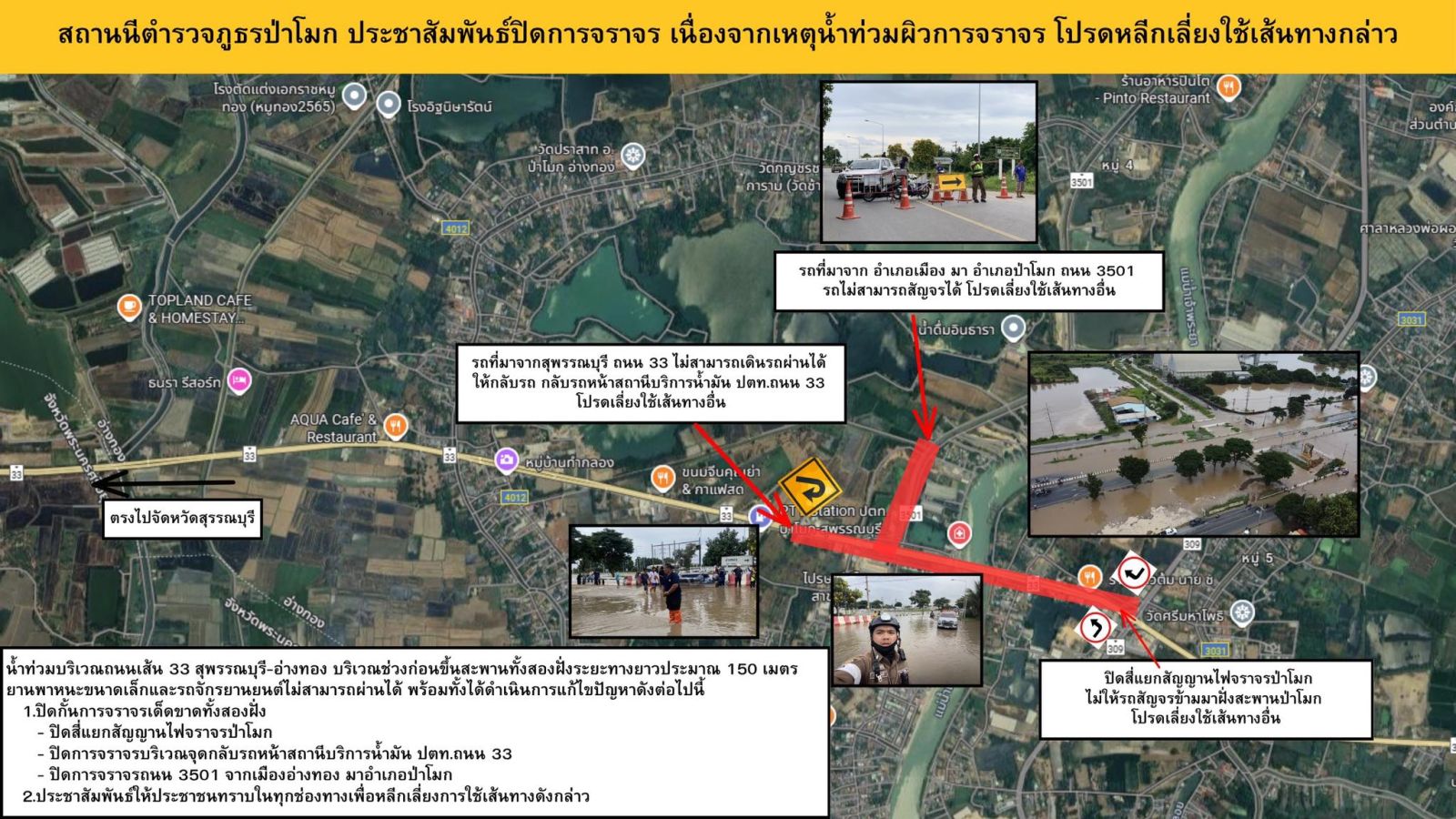 ขณะที่ ทางตำรวจภูธรอ่างทอง สภ.ป่าโมก แจ้งปชส.สำหรับเส้นทาง ถนนสาย 33 (สุพรรณบุรี–อ่างทอง) ช่วงทางขึ้นสะพานป่าโมก ข้ามแม่น้ำเจ้าพระยา มีน้ำท่วมขังช่วงก่อนขึ้นสะพานทั้งสองฝั่ง ระยะทางประมาณ 150 เมตร ยานพาหนะขนาดเล็กและรถจักรยานยนต์ไม่สามารถผ่านได้