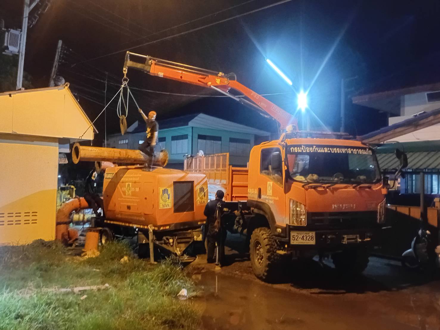 ด้าน กรมป้องกันและบรรเทาสาธารณภัย โดยศูนย์ป้องกันและบรรเทาสาธารณภัย เขต 1 ปทุมธานี สนับสนุนเครื่องสูบน้ำ ขนาดท่อส่ง 14 นิ้ว อัตราสูบ 28,000 ลิตร/นาที จำนวน 2 เครื่อง ให้แก่จังหวัดอ่างทอง โดยการประสานงานของ ปภ.อ่างทอง เพื่อเสริมกำลังรับมือสถานการณ์อุทกภัย จากการปรับเพิ่มการระบายน้ำของเขื่อนเจ้าพระยาในอัตรามากกว่า 2,700 ลบ.ม./วินาที ซึ่งจะช่วยลดผลกระทบในพื้นที่เขตเศรษฐกิจ เขตชุมชน กว่า 1,700 ครัวเรือน และพื้นที่ศูนย์ราชการ จังหวัดอ่างทอง ได้ โดยได้ติดตั้ง ณ 1)ใต้สะพานข้ามแม่น้ำเจ้าพระยา ศาลากลางจังหวัดอ่างทอง 2) ชุมชนทรัพย์สิน เทศบาลเมืองอ่างทอง โดยถือเป็นเครื่องจักรกลสมรรถนะสูง ใช้ในงานระบายน้ำ สูบส่งน้ำ หรือป้องกันและแก้ไขปัญหาน้ำท่วม กำลัง 137 แรงม้า ที่ 1,500 รอบต่อนาที ความจุถังน้ำมัน 100 ลิตร