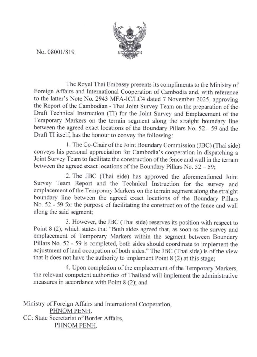โดยเมื่อวันที่ 4 พ.ย.68 ที่ผ่านมาชุดสำรวจและจัดทำหลักเขตแดนร่วมไทย-กัมพูชา โดยมี พ.อ.ยุทธพล สุจริต แม่กองสนามฯ ฝ่ายไทย นายพรมเซือน วัฒนะ แม่กองสนามฯ ฝ่ายกัมพูชา ได้ร่วมหารือการจัดทำคำแนะนำทางเทคนิคในการสำรวจและกำหนดหมุดชั่วคราว ระหว่างหลักเขตแดนที่ 52-59 พร้อมทั้งได้ลงนามเห็นชอบร่วมกันในคำแนะนำทางเทคนิคฯ ดังกล่าว โดยมี น.อ. ปรัชญา หาญเทียม ผบ.ฉก.นย.จันทบุรี น.อ.แทน ทองรับแก้ว รอง ผบ.ฉก.นย.จันทบุรี น.อ. วีระเชษฐ์ ขยันทำ หน.ชค.ทพ.นย.2 และนายสิทธินนทร์ เชียรชีระสกุล กำนันตำบลเทพนิมิตร เข้าร่วมหารือฯ ณ ด่านผ่านแดนถาวรช่องโดง อ.ก็อมเรียง จ.พระตะบอง ประเทศกัมพูชา