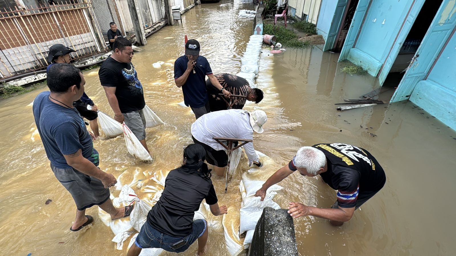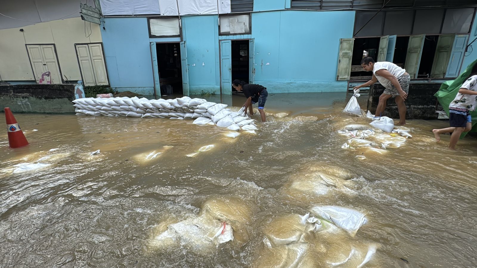 เจ้าหน้าที่เทศบาลนครนนทบุรี เร่งนำระสอบทรายเข้าซ่อมเสริมแนวเดิมให้แข็งแรงพร้อมกับเพิ่มระดับแนวกระสอบทรายให้สูงขึ้นจึงสามารถควบคุมน้ำไม่ให้ไหลเข้าชุมชนได้