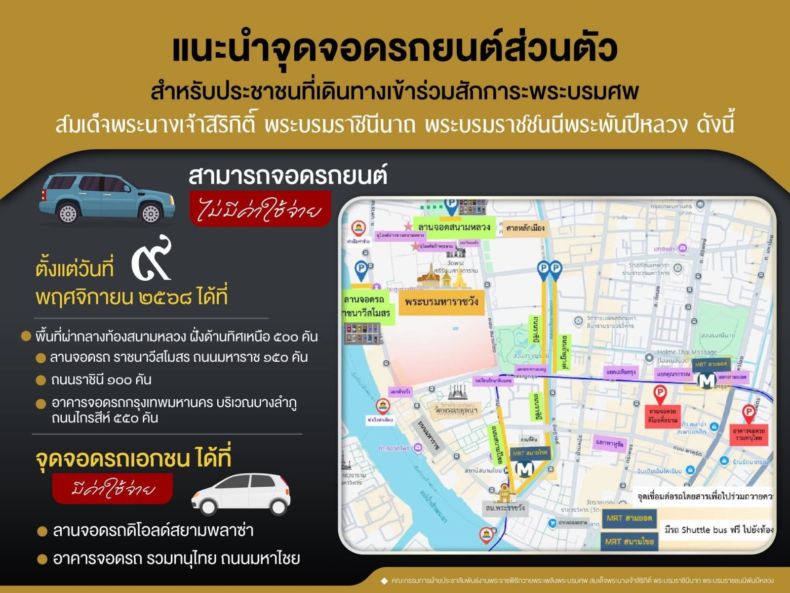 สามารถจอดรถยนต์ (ไม่มีค่าใช้จ่าย) ตั้งแต่วันที่ ๙ พฤศจิกายน ๒๕๖๘ ได้ที่