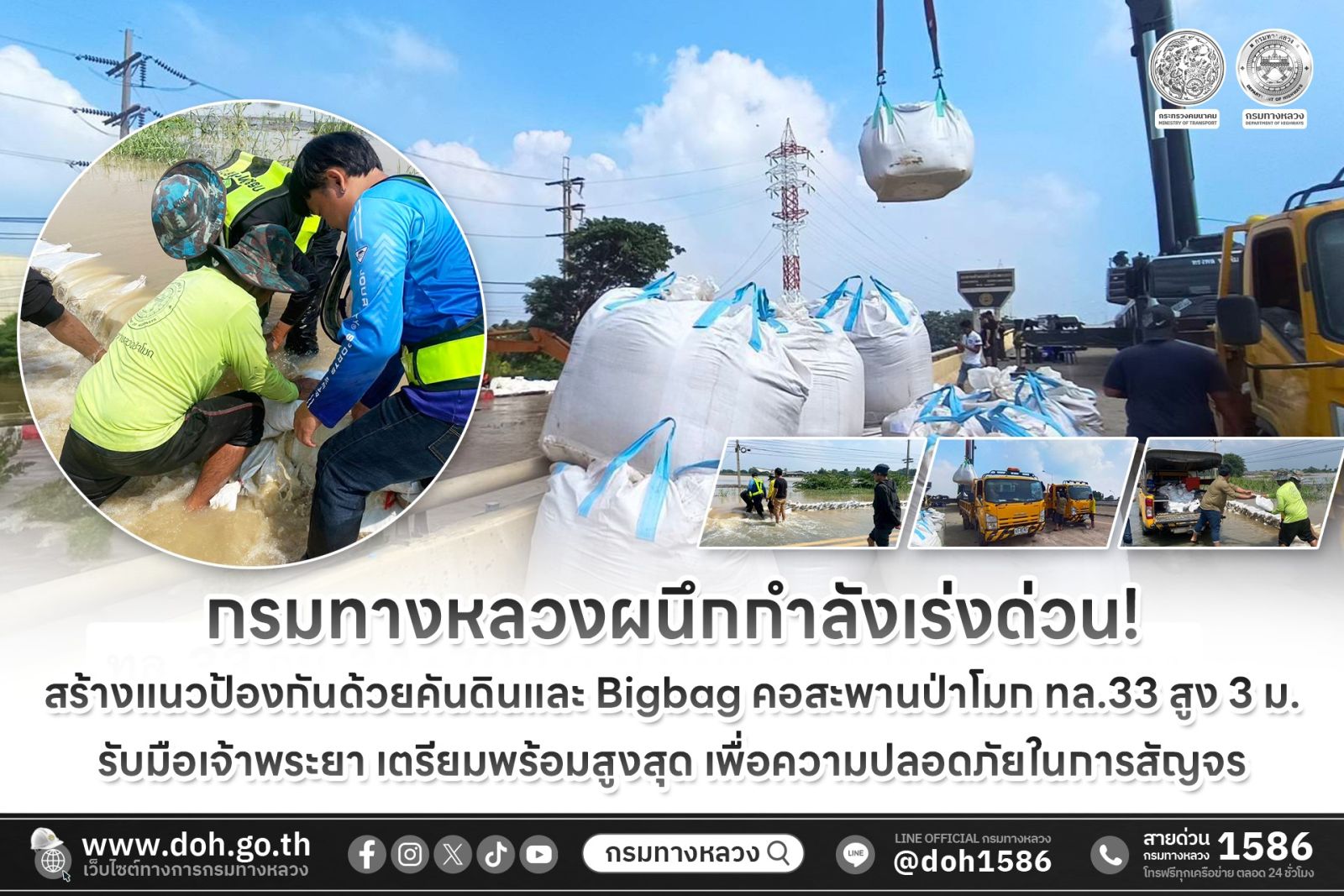 ทล.ผนึกกำลังเร่งด่วน! สร้างแนวป้องกันคอสะพานป่าโมก ทล.33 สูง 3 ม. รับมือเจ้าพระยา เตรียมพร้อมสูงสุด เพื่อความปลอดภัยในการสัญจร