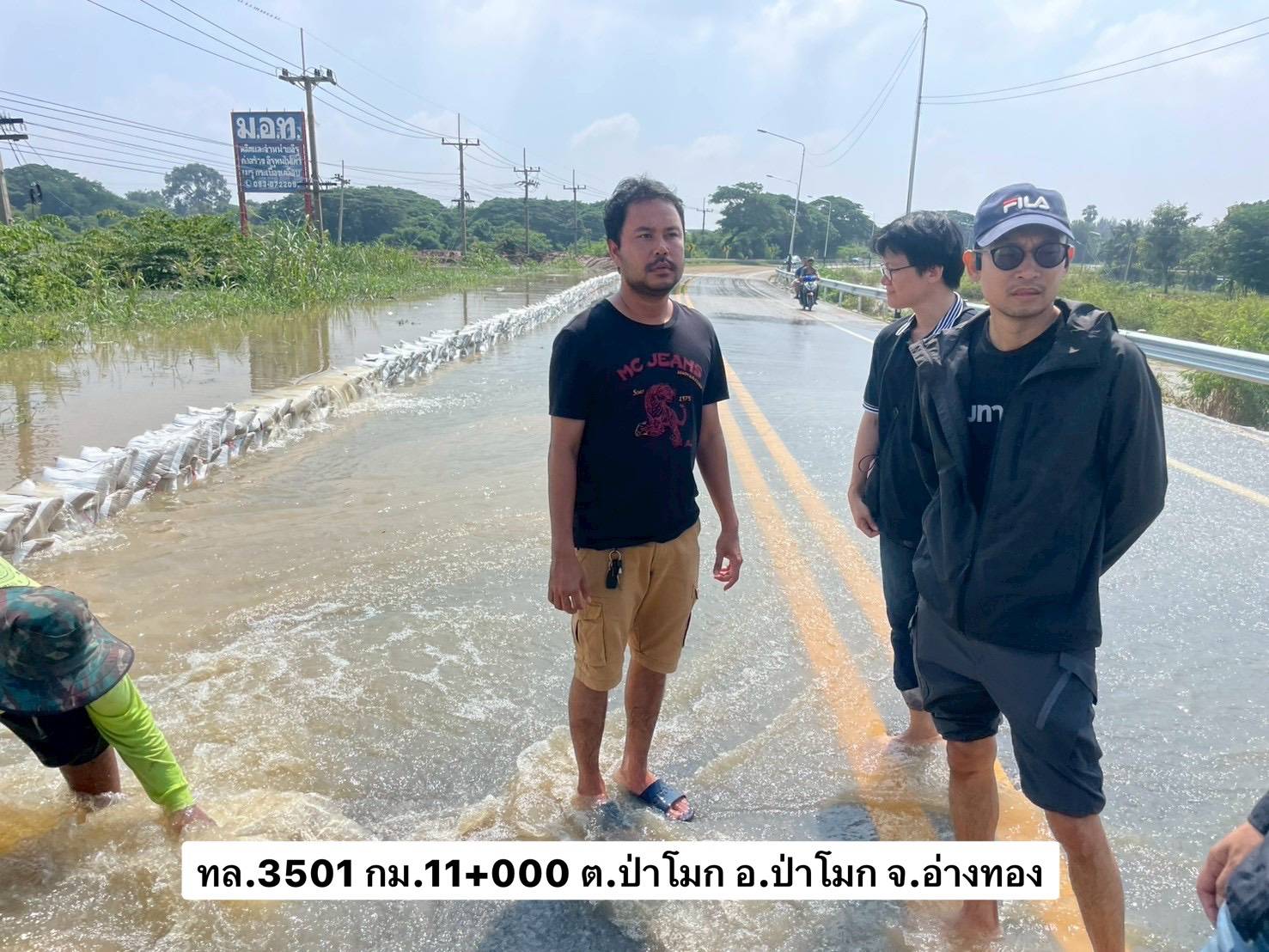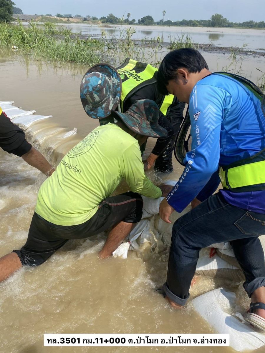 ในส่วนของการดูแลเส้นทางเลี่ยงน้ำท่วม บน ทล.3501 (อ่างทอง - บางหลวงโดด) ซึ่งเป็นเส้นทางเลาะริมแม่น้ำเจ้าพระยาฝั่งตะวันตก และได้รับผลกระทบบริเวณ กม.11+000 ซึ่งมีแนวโน้มที่ระดับน้ำจะไหลเข้าท่วมผิวจราจรได้ ทางเจ้าหน้าที่หมวดทางหลวงป่าโมกได้เข้าดำเนินการทันทีด้วยการวางแนวกระสอบกั้นน้ำที่มีความสูงประมาณ 20 เซนติเมตร ในระดับเสมอคันทาง และกำลังเร่งเสริมแนวกระสอบทรายและคันดิน เพื่อชะลอน้ำและรักษาพื้นผิวจราจรให้ใช้งานได้ โดยสถานการณ์ปัจจุบันเส้นทางนี้ยังสามารถสัญจรได้ตามปกติ และมีการจัดระบบการจราจรพร้อมป้ายแนะนำอย่างชัดเจน เพื่ออำนวยความสะดวกและดูแลความปลอดภัยของพี่น้องประชาชน