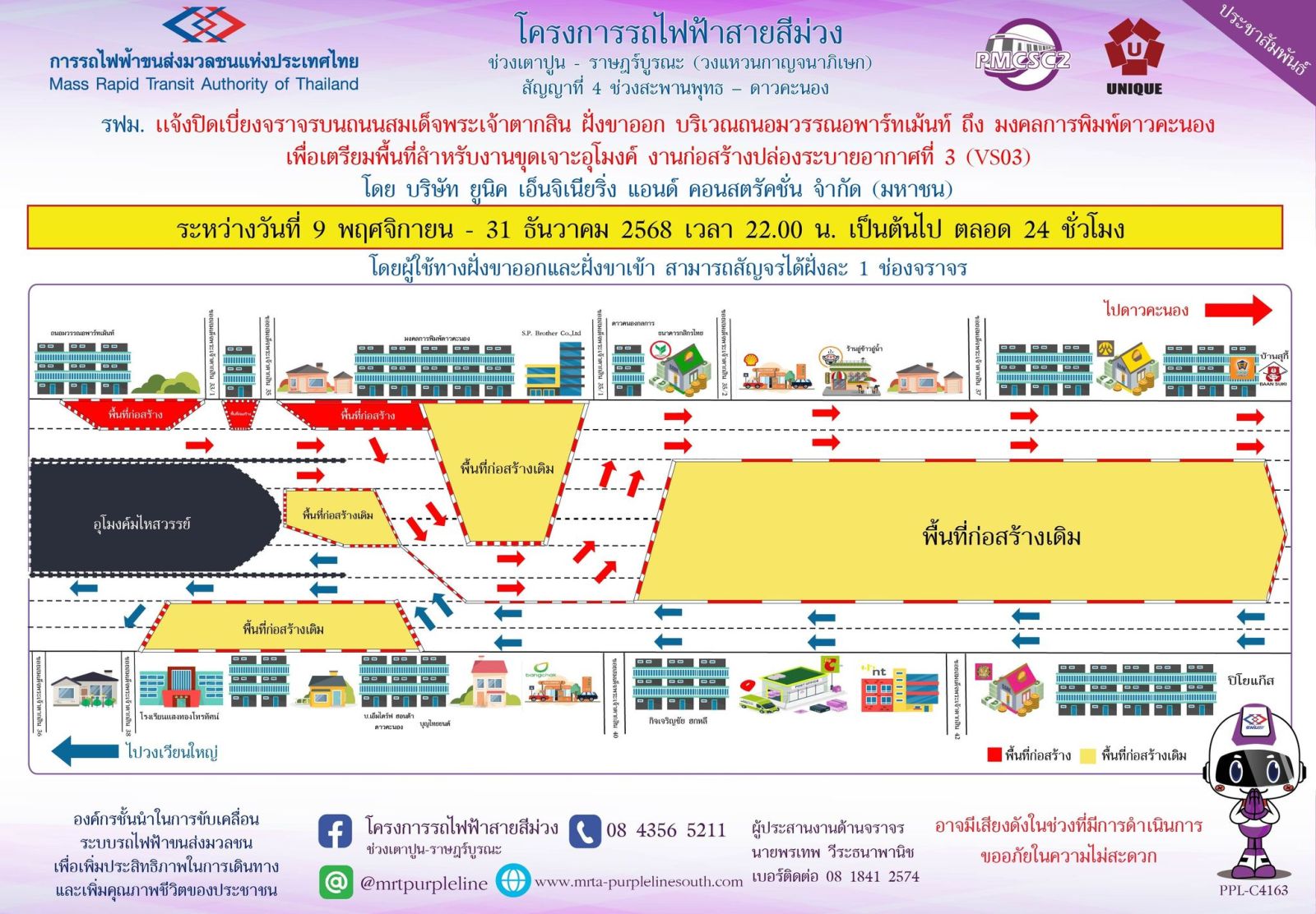การรถไฟฟ้าขนส่งมวลชนแห่งประเทศไทย (รฟม.) แจ้งว่า บริษัท ยูนิค เอ็นจิเนียริ่ง แอนด์ คอนสตรัคชั่น จำกัด (มหาชน) ผู้รับจ้างงานออกแบบและก่อสร้างอุโมงค์ทางวิ่งและสถานีใต้ดิน โครงการรถไฟฟ้าสายสีม่วง ช่วงเตาปูน - ราษฎร์บูรณะ (วงแหวนกาญจนาภิเษก) สัญญาที่ 4 ช่วงสะพานพุทธ - ดาวคะนอง มีความจำเป็นต้องปิดเบี่ยงจราจรบนถนนสมเด็จพระเจ้าตากสิน ฝั่งขาออก บริเวณถนอมวรรณอพาร์ทเม้นท์ ถึง มงคลการพิมพ์ดาวคะนอง เพื่อเตรียมพื้นที่สำหรับงานขุดเจาะอุโมงค์ งานก่อสร้างปล่องระบายอากาศที่ 3 (VS03) ระหว่างวันที่ 9 พฤศจิกายน – 31 ธันวาคม 2568 เวลา 22.00 น. เป็นต้นไป ตลอด 24 ชั่วโมง โดยผู้ใช้ทางฝั่งขาออกและฝั่งขาเข้า สามารถสัญจรได้ฝั่งละ 1 ช่องจราจร