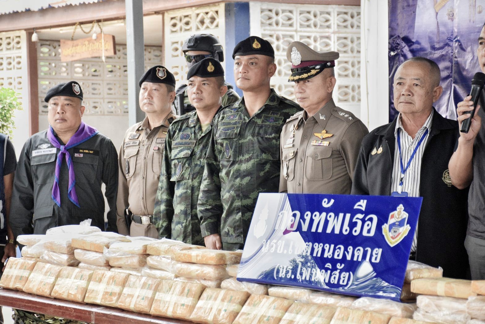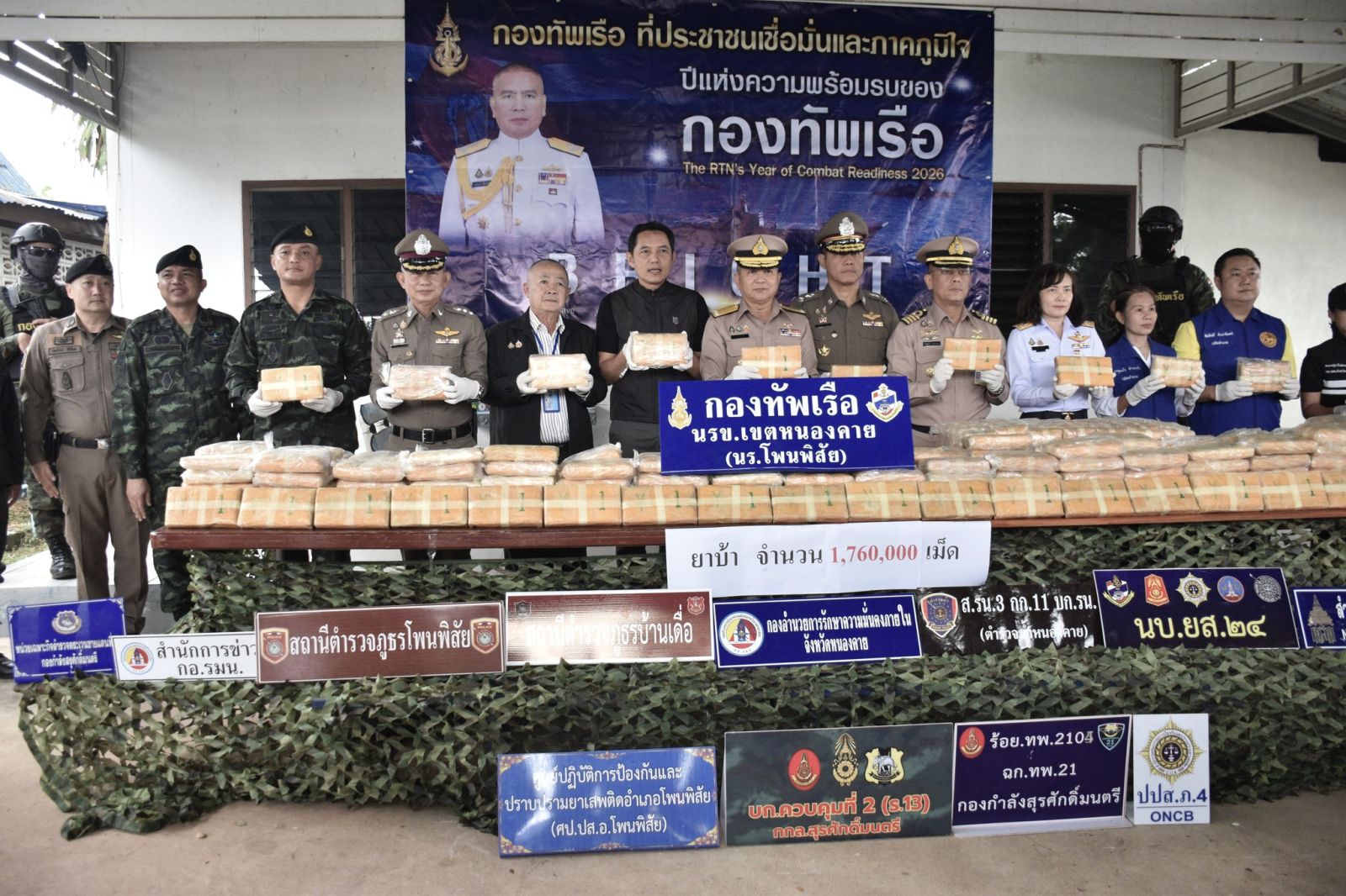 10 พ.ย. 2568 พ.อ. เรวัฒ ธรรมจิรเดช เสธ.กกล.สุรศักดิ์มนตรี พร้อมด้วย นาย ไพฑูรย์ มหาชื่นใจ รอง.ผวจ.หนองคาย, พล.ต.ต. อัทธชนน์ ช่วงงาม ผบก.ภ.จว.หนองคาย, พ.อ.อุดมการณ์ ศรีแขไตร รอง ผบ.บก.ควบคุมที่ 2 [ร.13] กกล.สุรศักดิ์มนตรี, สน.เรือโพนพิสัย นรข.เขตหนองคาย และหน่วยงานความมั่นคงในพื้นที่ ร่วมแถลงข่าวการจับกุมผู้ต้องหา 3 ราย พร้อมของกลาง ยาบ้า 1,760,000 เม็ด โดยมี พล.ร.ต. ณรงค์ เอมดี ผบ.นรข. เป็นประธานการแถลงข่าว ณ นร.โพนพิสัย นรข.เขตหนองคาย ต.วัดหลวง อ.โพนพิสัย จ.หนองคาย