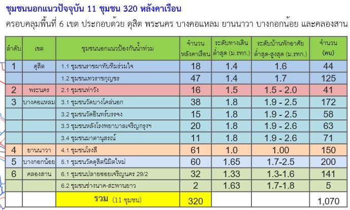 ข้อมูลจากสำนักการระบายน้ำ ระบุว่า กรุงเทพมหานครมี 11 ชุมชน นอกแนวคันป้องกันน้ำท่วมริมแม่น้ำเจ้าพระยา คลองบางกอกน้อย และคลองมหาสวัสดิ์ ครอบคลุมพื้นที่ 6 เขต ได้แก่ ดุสิต พระนคร บางคอแหลม ยานนาวา บางกอกน้อย และคลองสาน รวมทั้งสิ้น 320 หลังคาเรือน ประชากรราว 1,070 คน ซึ่งเป็นพื้นที่ตลิ่งต่ำและมีโอกาสได้รับผลกระทบโดยตรงหากระดับน้ำเพิ่มสูงขึ้น