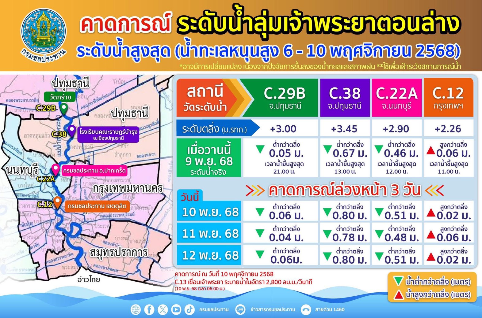 10 พ.ย.68 กรมชลประทาน รายงานว่ามีการระบายน้ำจากเขื่อนเจ้าพระยาเพิ่มขึ้นเป็น 2,900 ลูกบาศก์เมตรต่อวินาที เพื่อระบายมวลน้ำจากตอนเหนือ ส่งผลให้พื้นที่ลุ่มต่ำสองฝั่งแม่น้ำเจ้าพระยาใน จังหวัดนนทบุรี ปทุมธานี และกรุงเทพฯ ต้องเฝ้าระวังใกล้ชิด โดยเฉพาะในจุดที่แนวตลิ่งต่ำหรือคันป้องกันชำรุด
