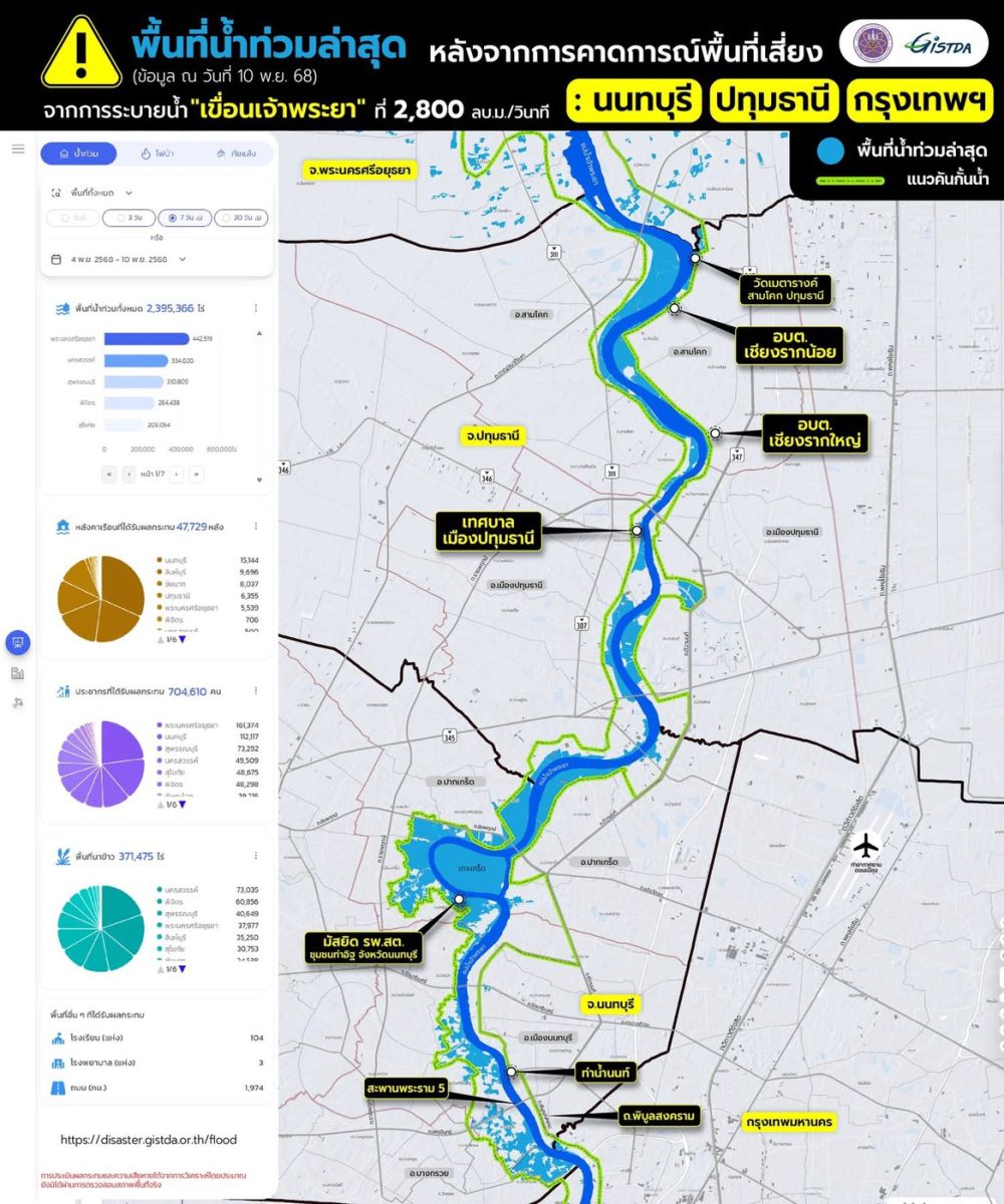 ในขณะเดียวกัน GISTDA เผยภาพดาวเทียมล่าสุดยืนยันว่า พื้นที่เสี่ยงน้ำท่วมที่คาดการณ์ไว้ก่อนหน้านี้ได้เกิดน้ำเอ่อเข้าท่วมจริงในหลายจุด เช่น เทศบาลเมืองปทุมธานี บางกรวย ท่าน้ำนนท์ และบางส่วนของเขตบางพลัดในกรุงเทพฯ ซึ่งเป็นพื้นที่นอกแนวคันกั้นน้ำ