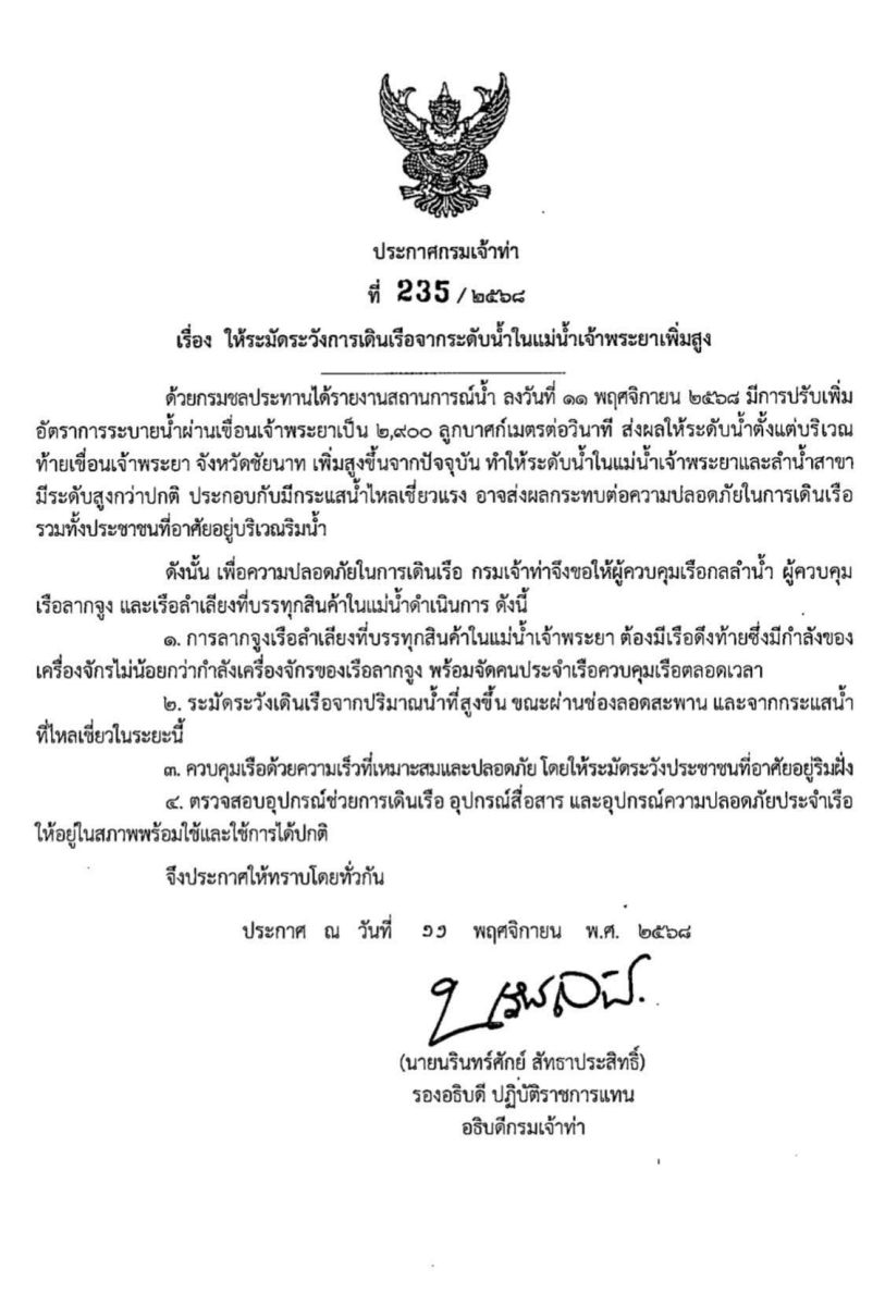 วันที่ 11 พฤศจิกายน 2568 นายอำนาจ สอนหมวก ผู้อำนวยการสำนักงานเจ้าท่าภูมิภาคสาขานนทบุรี ออกประกาศ ที่ 59/2568 เรื่อง “ให้ระมัดระวังการเดินเรือและเฝ้าระวังระดับน้ำเพิ่มสูงขึ้น” หลังกรมชลประทานได้ปรับเพิ่มการระบายน้ำจากเขื่อนเจ้าพระยา เมื่อวันที่ 9 พฤศจิกายน เวลา 15.00 น. อยู่ที่ระดับ 2,800 ลูกบาศก์เมตรต่อวินาที ประกอบกับช่วงนี้มีน้ำทะเลหนุนสูงจนถึงวันที่ 14 พฤศจิกายน ส่งผลให้ระดับน้ำในแม่น้ำเจ้าพระยาเพิ่มสูงขึ้นและอาจส่งผลกระทบต่อประชาชนในพื้นที่ลุ่มต่ำริมฝั่ง โดยเฉพาะในพื้นที่ จังหวัดปทุมธานี (อำเภอเมือง, อำเภอสามโคก) และ จังหวัดนนทบุรี (อำเภอปากเกร็ด, อำเภอเมือง) รวมถึงพื้นที่ต่อเนื่อง