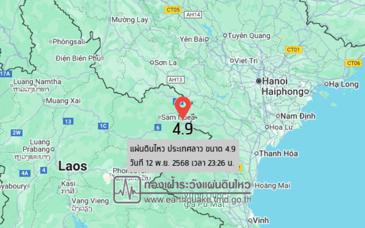 วันที่ 12 พ.ย. 2568 เวลา 23:26 น. กองเฝ้าระวังแผ่นดินไหว กรมอุตุนิยมวิทยา แจ้งเหตุ แผ่นดินไหว ขนาด 4.9 ความลึก 10 กม. ภายในพื่นที่ของประเทศลาว (20.36°N,104.47°E) ศูนย์กลางห่างออกไปทางทิศตะวันออกเฉียงเหนือของ ต.หอคำ อ.เมืองบึงกาฬ จ.บึงกาฬ ประมาณ 240 กม. ยังไม่มีรายงานผลกระทบต่อประเทศไทย