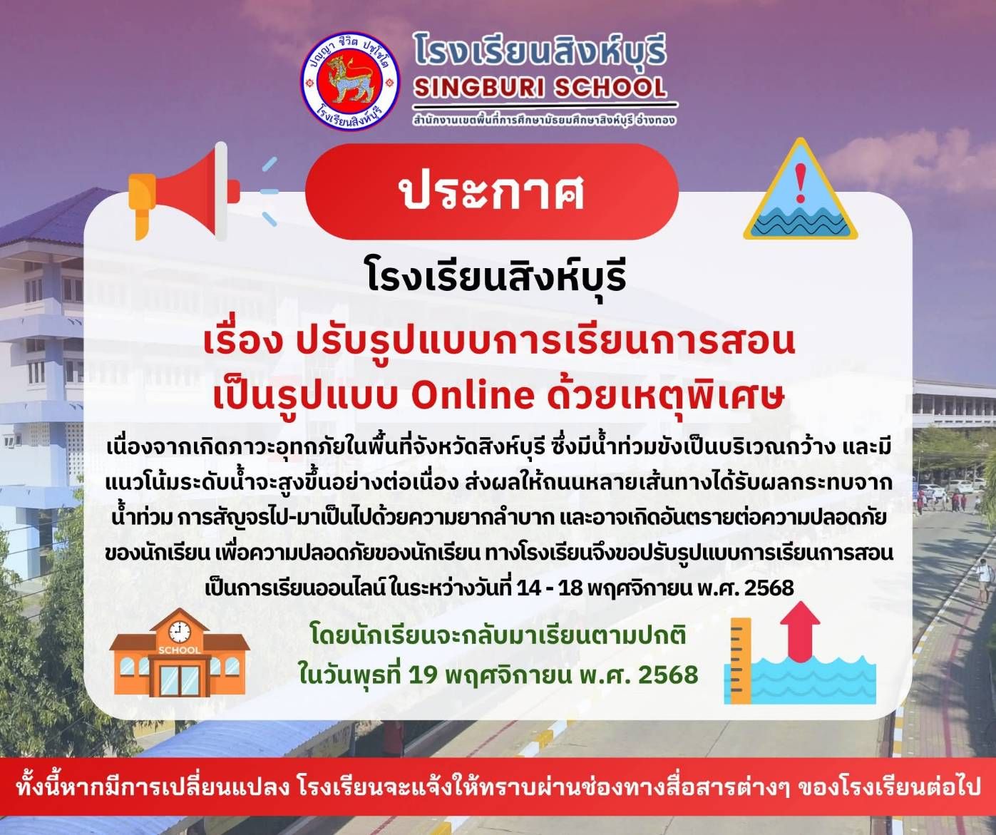 ด้วยขณะนี้เกิดสถานการณ์น้ำท่วมในหลายพื้นที่ของจังหวัดสิงห์บุรี ซึ่งมีระดับน้ำเพิ่มสูงขึ้นอย่างต่อเนื่อง ส่งผลให้การเดินทางของนักเรียน ผู้ปกครอง ครู และบุคลากร เป็นไปด้วยความยากลำบาก และอาจเกิดความไม่ปลอดภัยระหว่างการสัญจร เพื่อความปลอดภัยและความต่อเนื่องทางการเรียน โรงเรียนจึงขอปรับรูปแบบการเรียนการสอน เป็นแบบออนไลน์ด้วยเหตุพิเศษ ในระหว่างวันที่ 14 – 18 พฤศจิกายน พ.ศ. 2568