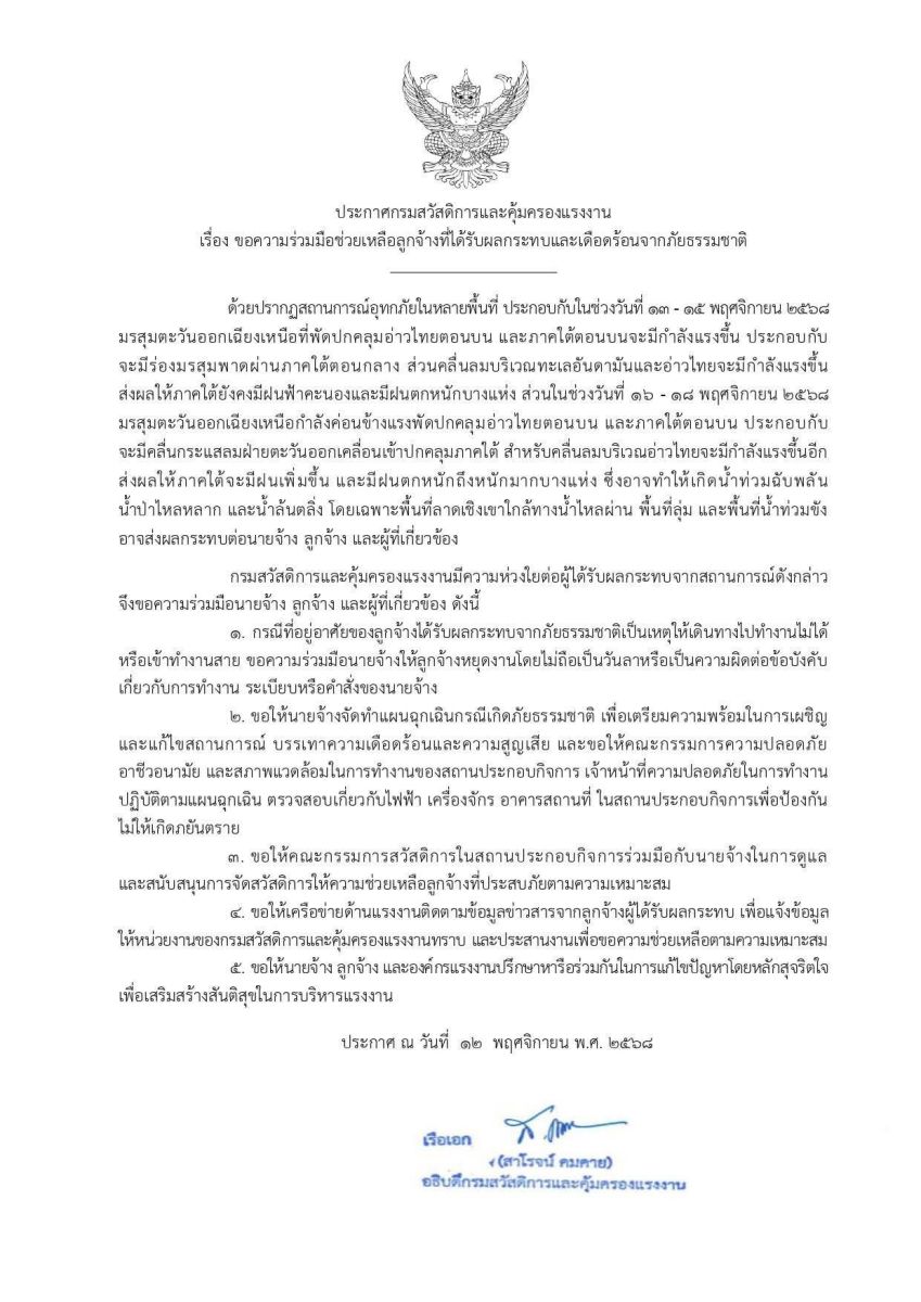 13 พ.ย. 2568 เรือเอก สาโรจน์ คมคาย อธิบดีกรมสวัสดิการและคุ้มครองแรงงาน (กสร.) กล่าวว่า จากสถานการณ์อุทกภัยเนื่องจากน้ำไหลหลากและน้ำล้นตลิ่งหลายพื้นที่ โดยเฉพาะจังหวัดทางภาคกลาง นางสาวตรีนุช เทียนทอง รัฐมนตรีว่าการกระทรวงแรงงาน ได้มีความห่วงใยต่อลูกจ้างและนายจ้างทุกคนที่ได้รับผลกระทบและได้สั่งการให้กรมสวัสดิการและคุ้มครองแรงงาน มีหนังสือขอความร่วมมือผู้ประกอบการมีมาตรการช่วยเหลือลูกจ้างกรณีที่พักอาศัยน้ำท่วมไม่สามารถไปทำงานได้