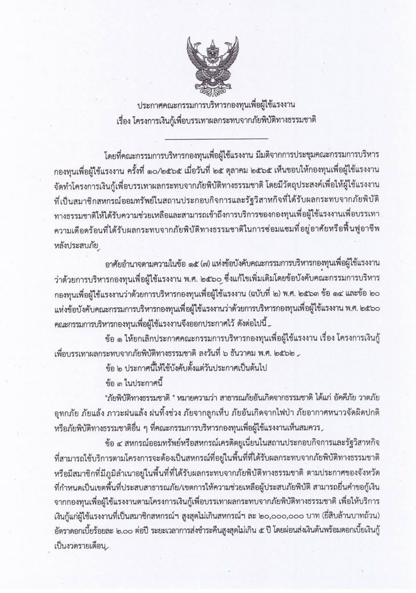 อธิบดี กสร. กล่าวเพิ่มเติมว่า นอกจากนี้ กรมฯ ได้จัดเตรียม “โครงการเงินกู้เพื่อบรรเทาผลกระทบจากภัยพิบัติทางธรรมชาติ” โดยปล่อยกู้ดอกเบี้ยต่ำผ่านสหกรณ์ออมทรัพย์หรือสหกรณ์เครดิตยูเนี่ยนในสถานประกอบกิจการและรัฐวิสาหกิจ สามารถยื่นคำขอกู้เงินจากกองทุนฯ ได้สูงสุดถึงสหกรณ์ละ 20 ล้านบาทด้วยอัตราดอกเบี้ยพิเศษเพียงร้อยละ 2.00 ต่อปี เพื่อนำไปปล่อยกู้ให้ลูกจ้างใช้ซ่อมแซมที่อยู่อาศัยหรือฟื้นฟูอาชีพที่เสียหายหลังประสบภัย