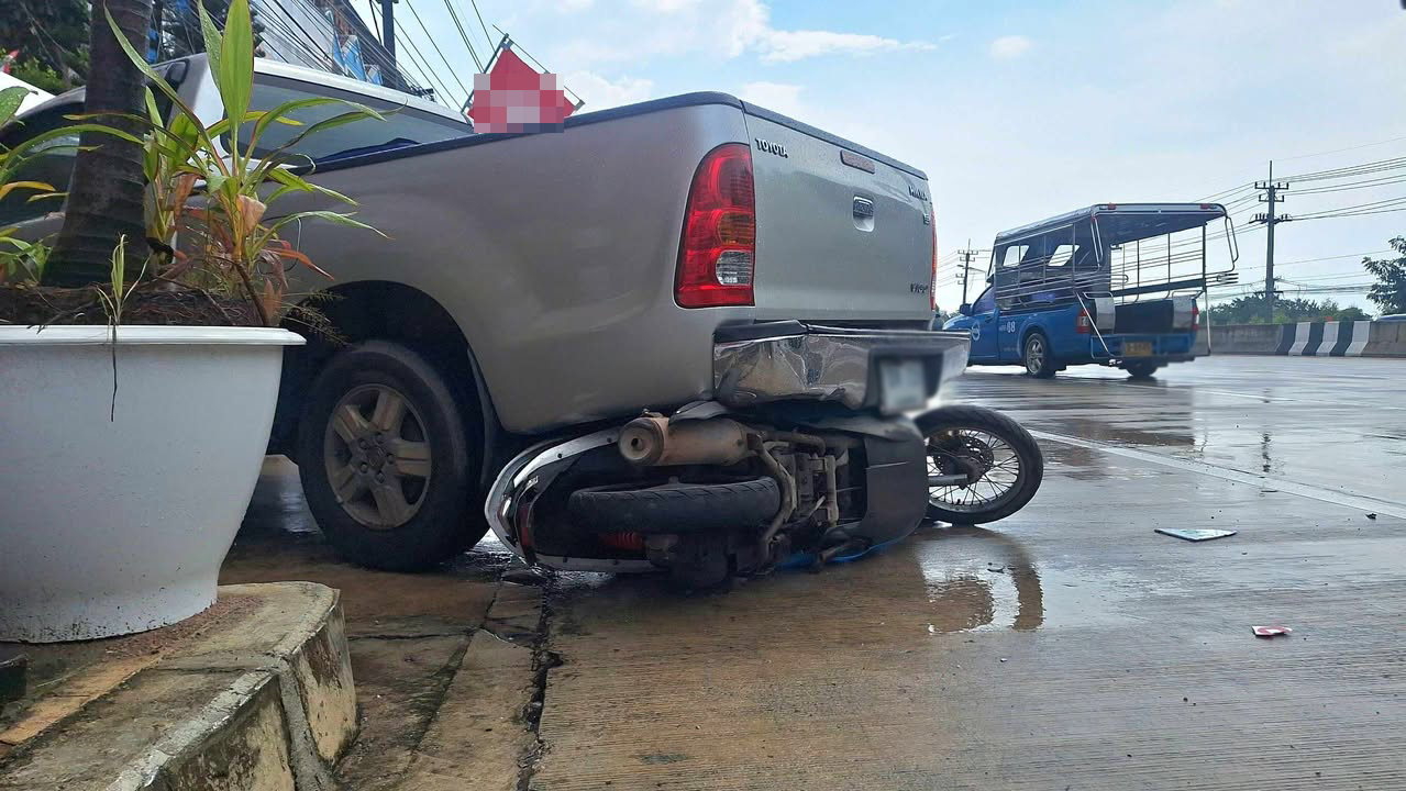 ใกล้กันพบ รถจักรยานยนต์ ฮอนด้า สกูปปี้ สีฟ้า-ดำ ทะเบียน ระยอง ถูกพุ่งชนกระเด็นไปติดคาอยู่บริเวณท้ายรถกระบะที่จอดอยู่ข้างทาง ห่างออกไปราว 30 เมตร บนฟุตบาทพบร่าง ชายไทย อายุ 47 ปี คนขี่รถจักรยานยนต์ เสียชีวิตคาที่ ท่ามกลางความโศกเศร้าของผู้เห็นเหตุการณ์