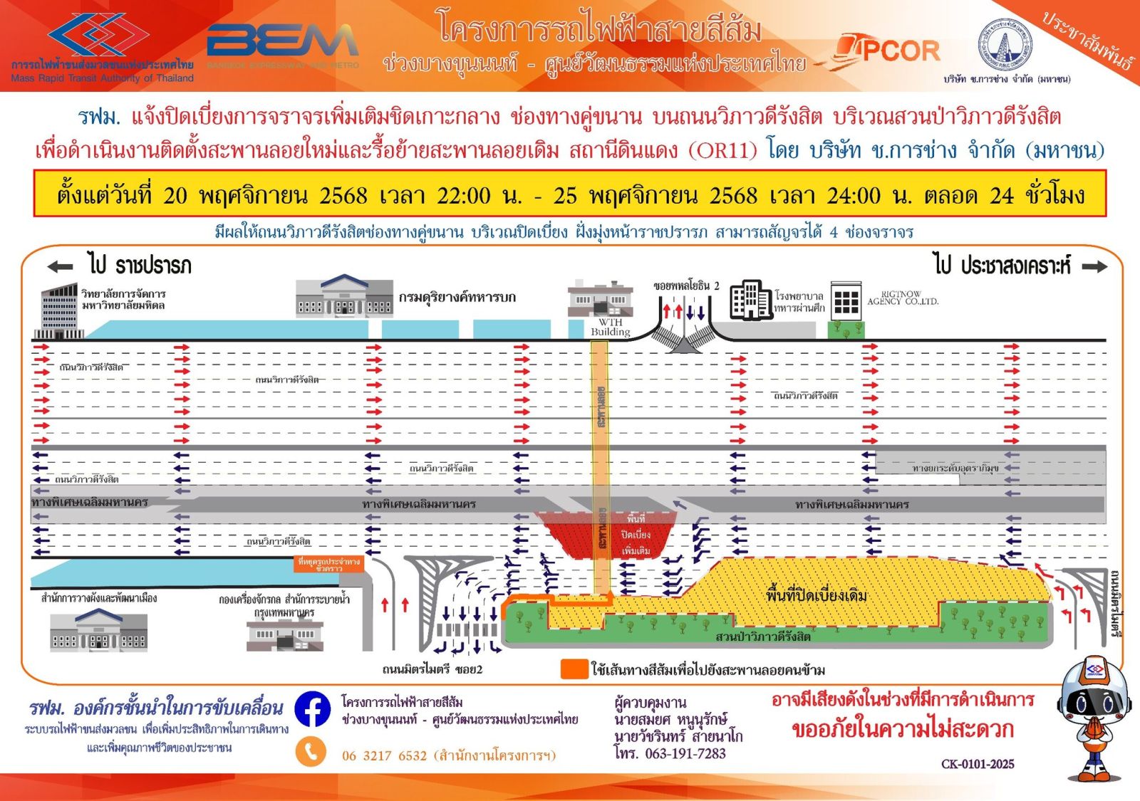การรถไฟฟ้าขนส่งมวลชนแห่งประเทศไทย (รฟม.) แจ้งว่า บริษัท ช.การช่าง จำกัด (มหาชน) ผู้รับจ้างออกแบบและก่อสร้างอุโมงค์ทางวิ่งและสถานีใต้ดิน โครงการรถไฟฟ้าสายสีส้ม ช่วงบางขุนนนท์ – ศูนย์วัฒนธรรมแห่งประเทศไทย มีความจำเป็นต้องปิดเบี่ยงการจราจรเพิ่มเติม 4 ช่องจราจร ชิดเกาะกลาง ช่องทางคู่ขนาน บนถนนวิภาวดีรังสิตฝั่งมุ่งหน้าราชปรารภ บริเวณสวนป่าวิภาวดีรังสิต เพื่อดำเนินงานติดตั้งสะพานลอยใหม่และรื้อย้ายสะพานลอยเดิม สถานีดินแดง (OR11) ตั้งแต่วันที่ 20 พฤศจิกายน 2568 เวลา 22.00 น. – 25 พฤศจิกายน 2568 เวลา 24.00 น. (ตลอด 24 ชั่วโมง) มีผลให้ถนนวิภาวดีรังสิตช่องทางคู่ขนาน บริเวณปิดเบี่ยง ฝั่งมุ่งหน้าราชปรารภ สามารถสัญจรได้ 4 ช่องจราจร โดยประชาชนสามารถเข้า – ออกที่พักอาศัยได้ตามปกติ